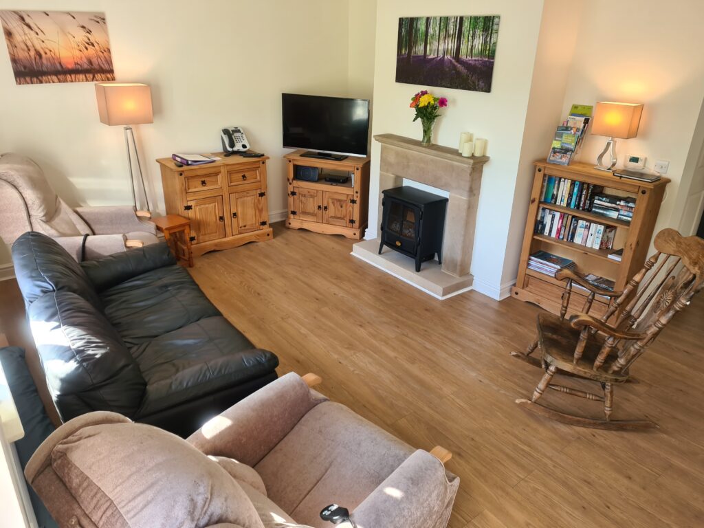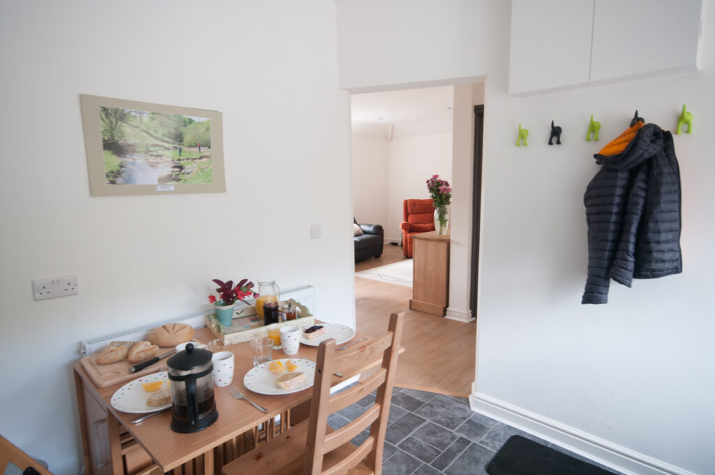 The kitchen is fully equipped with modern appliances including a washing machine, dishwasher, oven with a four-ring hob, fridge freezer, microwave, toaster and kettle. Guests can choose to eat in the kitchen or move the table to the adjacent lounge for a change of scenery.