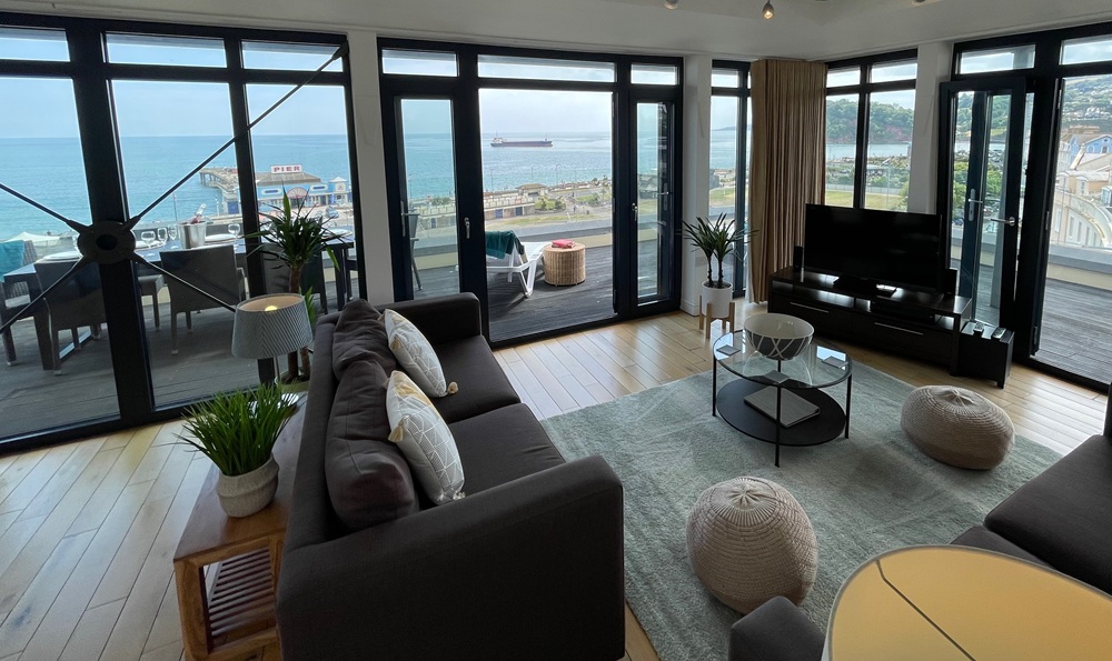 Perched at the top of the building, Penthouse 5 is accessed via a flight of stairs from the main lobby and is bathed in natural light from two glass domes. The expansive open-plan living area features two large sofas, one converting into a double bed, a fully fitted kitchen with granite worktops, an American-style fridge/freezer and high-end appliances, plus a dining area that seats eight. Entertainment includes a 40” flat-screen TV and Blu-ray player with surround sound, while a utility room offers a washer/dryer and ironing facilities. The master bedroom boasts a super king bed, an ensuite with stunning estuary views and access to the wraparound balcony. Bedroom two includes twin beds, a dressing area, an ensuite wet room and balcony access with panoramic views of the Jurassic Coastline and Teignmouth. Bedroom three has a king-size bed and estuary views. A second wet room adds convenience. The private wraparound balcony, with seating for eight and sun loungers, provides unrivalled views of Shaldon, Teignmouth, and the coastline from Weymouth to Brixham, completing this exceptional apartment.