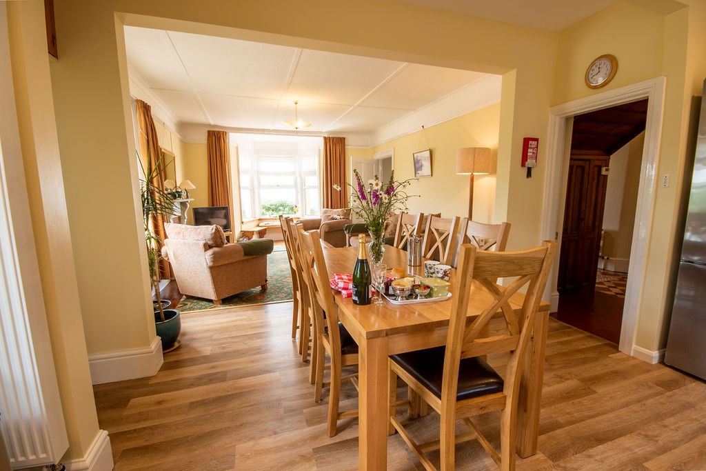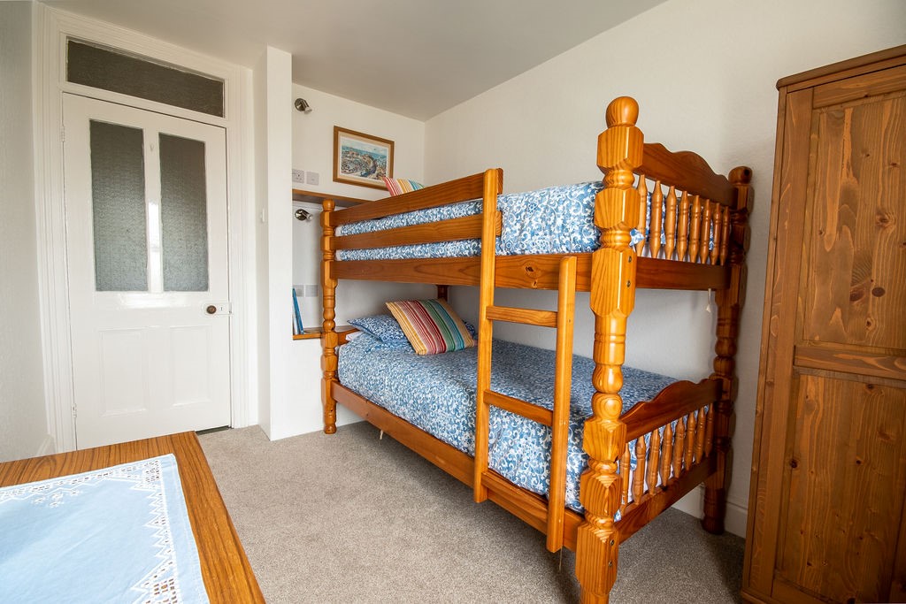 This holiday cottage comfortably accommodates seven people. Upstairs there are three bedrooms – a main bedroom with a king size double and a single bed, another double and a third bedroom with bunk beds. Downstairs there is a large lounge including bay windows that look out to sea. The lounge has a Freeview digital TV, DVD, woodburning stove, dining table and sofas. Plus there is a large, fully equipped kitchen with dining area. There is also a separate toilet & washbasin and traditional hallway.