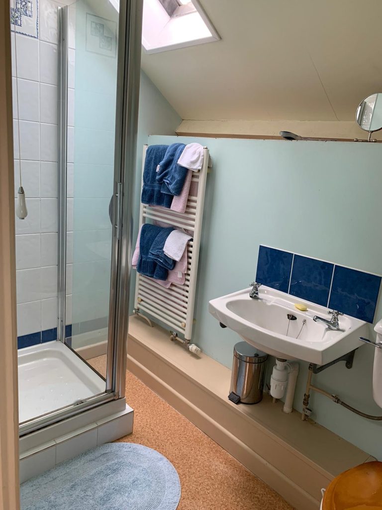 We offer a two-bedroom cottage (one double, one twin, both with ensuite shower rooms) sleeping up to 4 plus a cot for couples, families, or individuals. Downstairs through the front door is a porch and cloakroom with WC and washbasin, and a door into a large open-plan lounge and kitchen/dining area with access outside through 2 sets of attractive arched French doors. The kitchen is very well-equipped with eye level double electric oven with grill and a gas hob, dishwasher, washing machine and has ample work tops and cupboards. You can also enjoy our own spring water “on-tap”. The lounge has a TV and DVD player, and free Wi-Fi.
