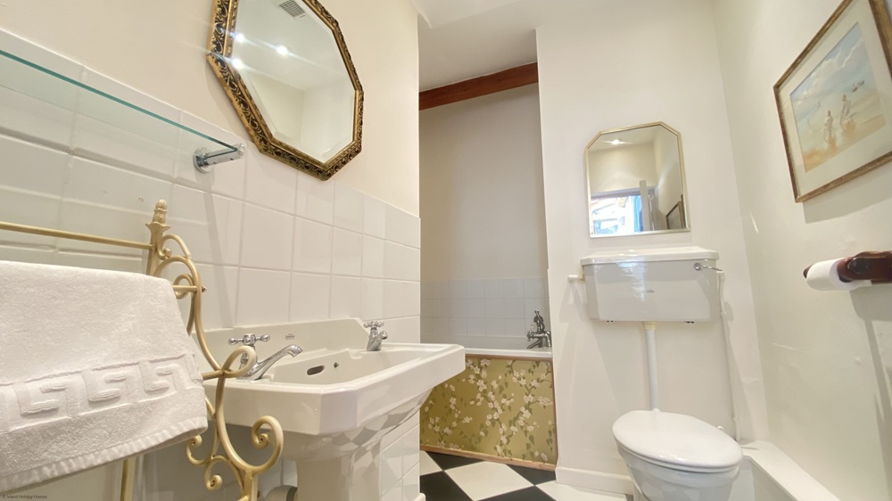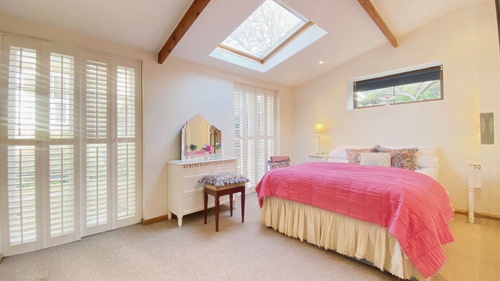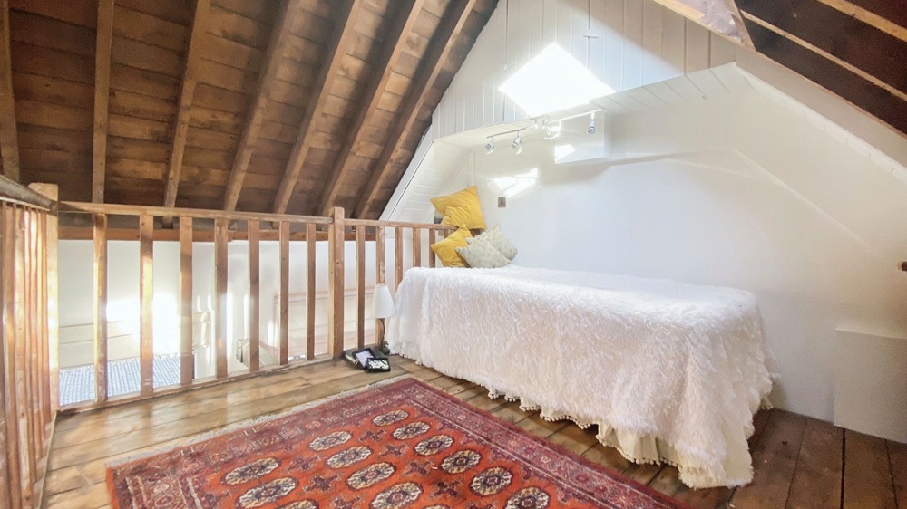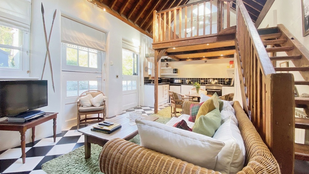 The large double bedroom offers a peaceful sanctuary, featuring a luxurious king-size bed and direct access to a private courtyard garden where you can sit back and enjoy the fresh coastal air. An elegant en-suite shower room adds to the sense of comfort and convenience. There is also a bright sunroom furnished with comfortable chairs and a coffee table, perfect for leisurely breakfasts or a quiet afternoon read while looking out onto the walled courtyard. A unique mezzanine reading gallery overlooking the lounge provides an additional peaceful corner for unwinding with a good book.