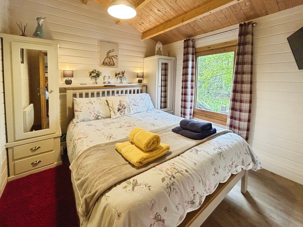 Inside, the cabin exudes warmth and charm, with an inviting open-plan living space featuring exposed beams, a cosy woodburner and a plush sofa that’s perfect for unwinding after a day spent outdoors. The well-equipped kitchen includes an electric oven and hob, microwave and fridge/freezer, ensuring everything you need for a comfortable self-catering stay. The spacious shower room offers a touch of modern comfort with a large walk-in shower, while the beautifully appointed double bedroom provides restful lake views and thoughtful finishing touches that complement the peaceful surroundings.