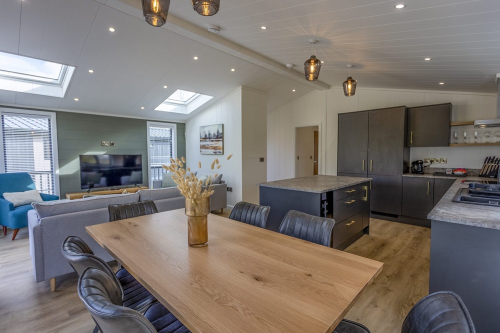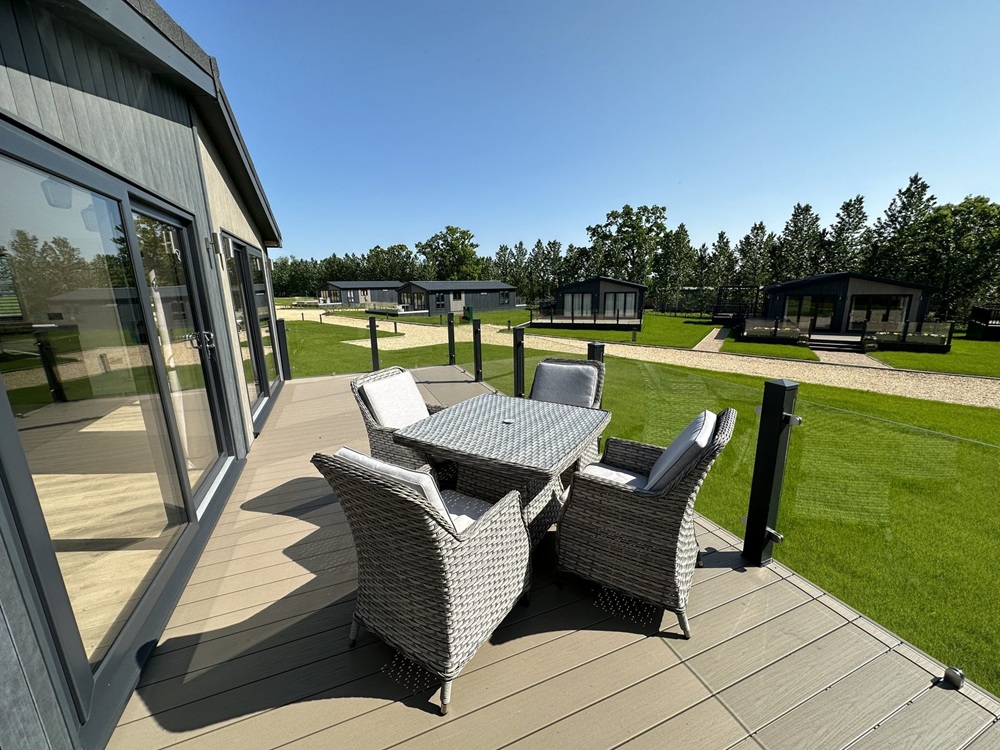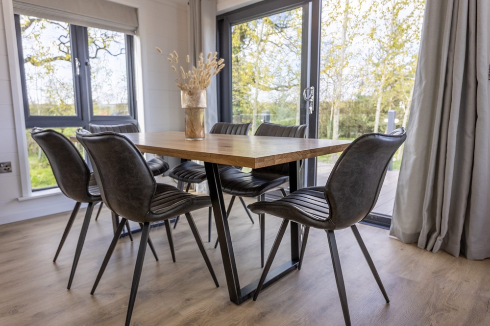 Isca Lodge with private decking is a spacious and stylish three-bedroom retreat that also sleeps up to six guests. It features a generous open-plan living area with plush seating, a social dining space and a fully equipped kitchen containing all the necessities for a self-catering stay. Two modern bathrooms, including one en-suite, complement the three beautifully furnished bedrooms and towels and bed linen are provided. The private decking offers an inviting spot for morning coffee or evening drinks outdoors.