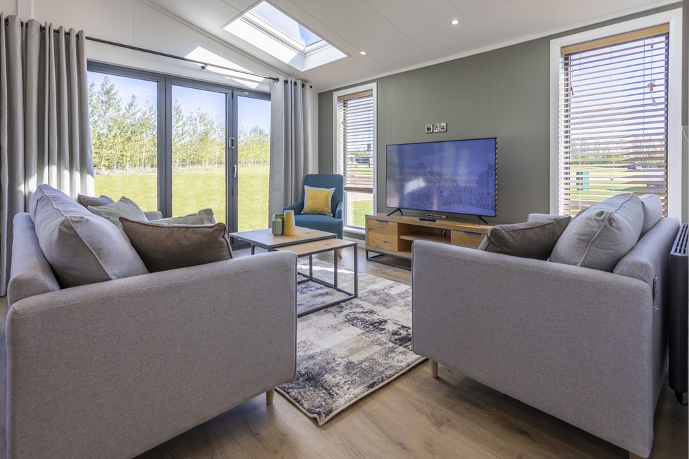 Rye Lodge (non-decked) is a contemporary and comfortable three-bedroom property ideal for families or groups of friends. Accommodating up to six guests, it provides an open-plan living area and a fully equipped kitchen with all essential items, including cookware, crockery, cutlery, tea towels and washing-up liquid. The lodge has two modern bathrooms, one of which is en-suite and although it does not include private decking, it offers easy access to outdoor space and on-site parking in a peaceful countryside setting.