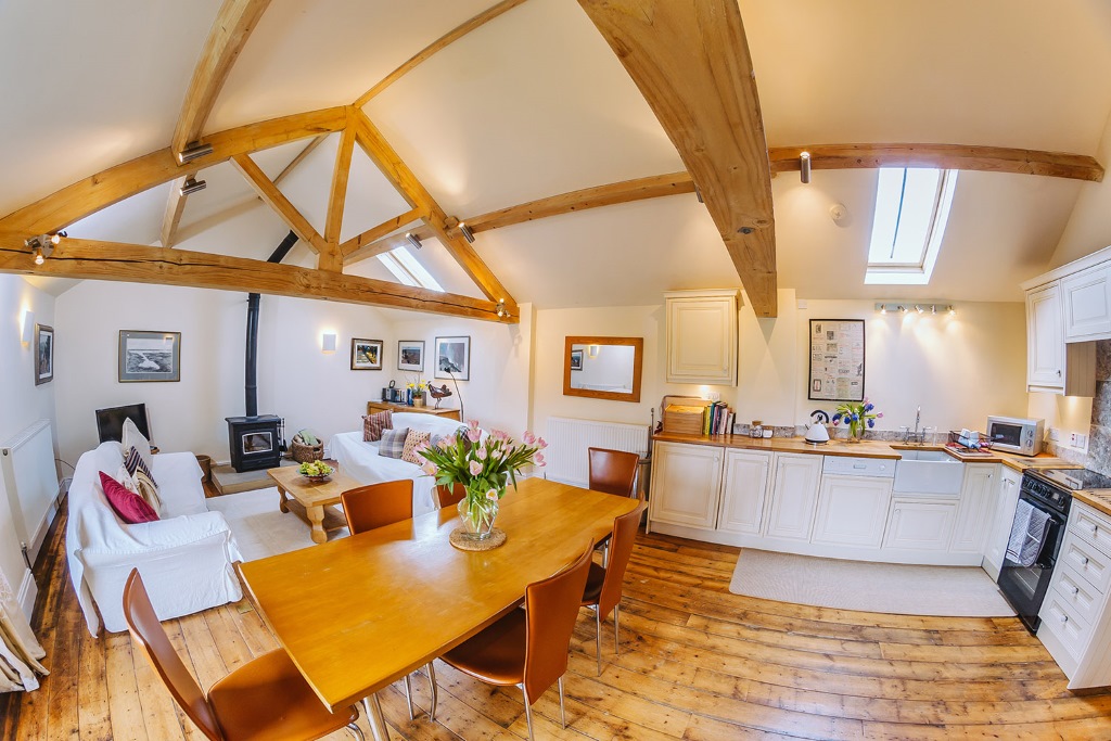 Kitchen/Diner/Sitting Room: This is a spectacular contemporary, light, airy room with open pine beams in the ceiling and delightful views across the village green. There is a wood burning stove to snuggle around in the winter and deep comfy sofas with a handmade oak coffee table made by an up and coming local furniture maker. The large colour television includes a DVD player, Freeview box, plus there is a separate radio and CD player with Bluetooth.. For those (rare) rainy days there are a selection of games, cards and books.