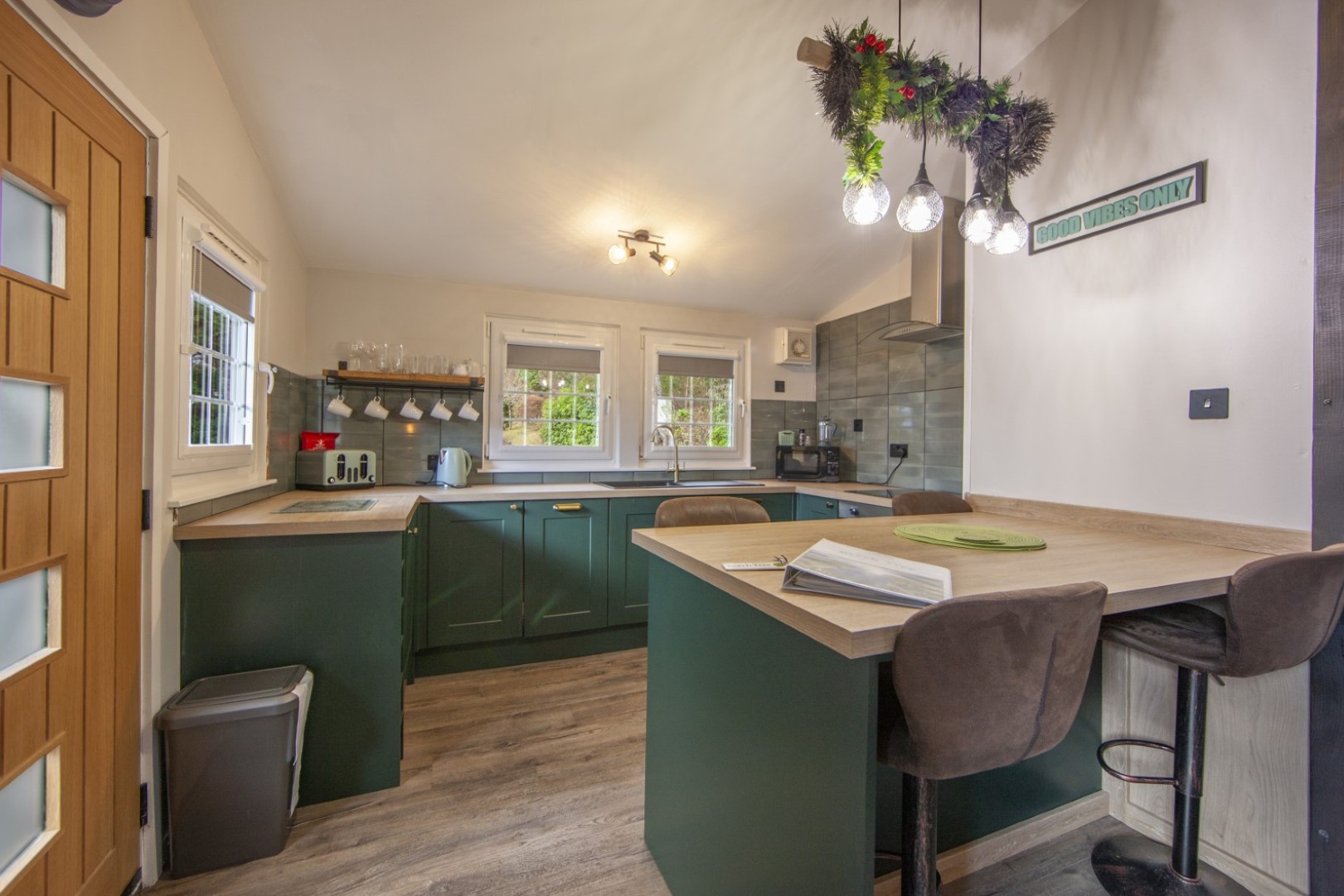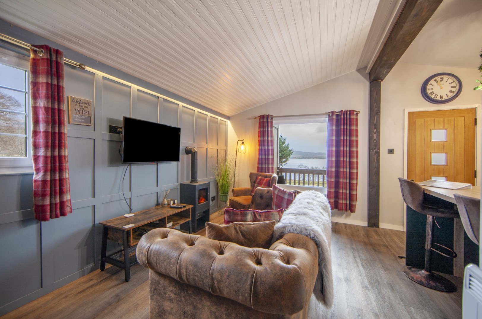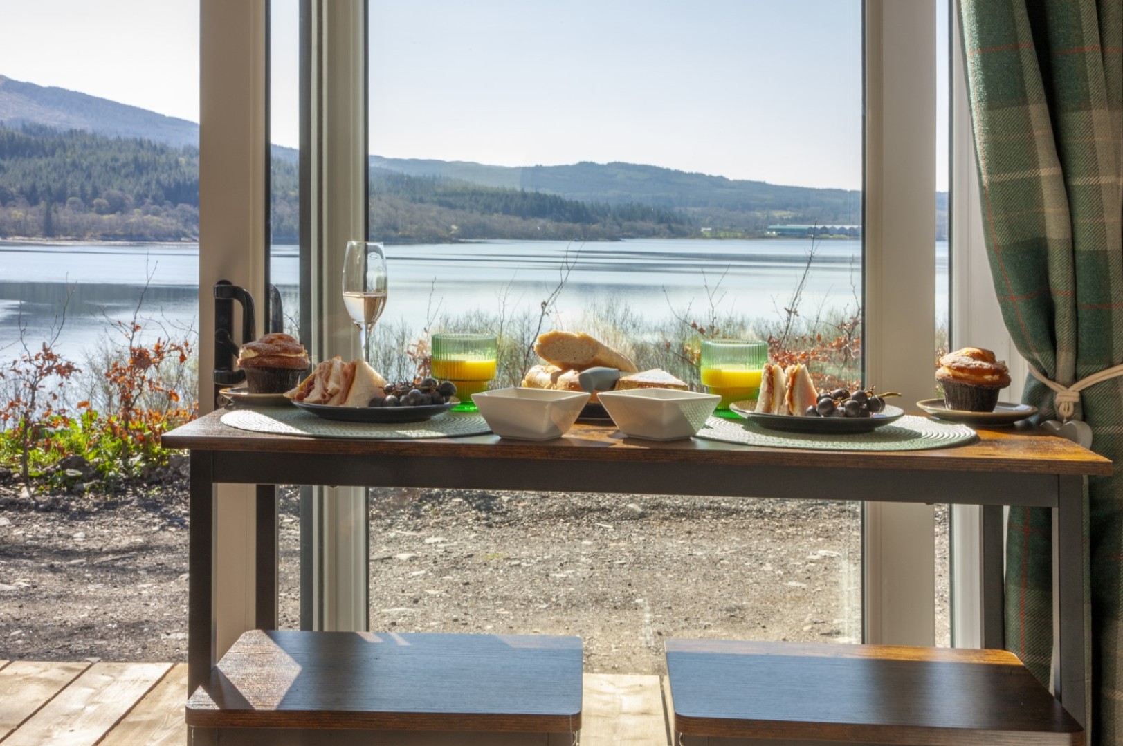 Each lodge features two comfortable bedrooms, including one double and one twin, providing a great option for couples, families or small groups travelling together. Inside, guests can enjoy a light and welcoming living area, a well-equipped kitchen for preparing meals, and modern bathroom facilities, offering everything needed for a relaxing and convenient stay after a day exploring the surrounding walks, lochs and coastline.