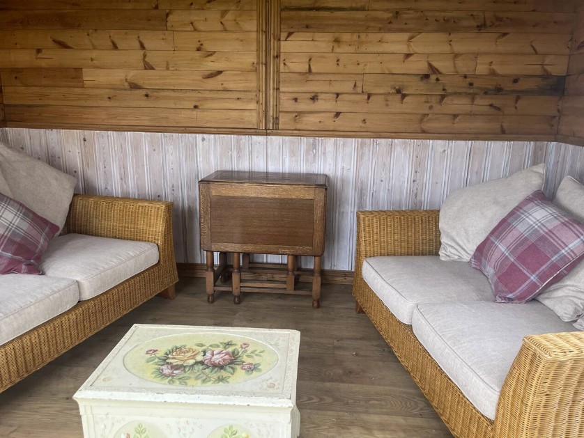 Outside there is a lawned garden and patio area. A lovely place to relax with a glass of wine whilst the sun is shining.