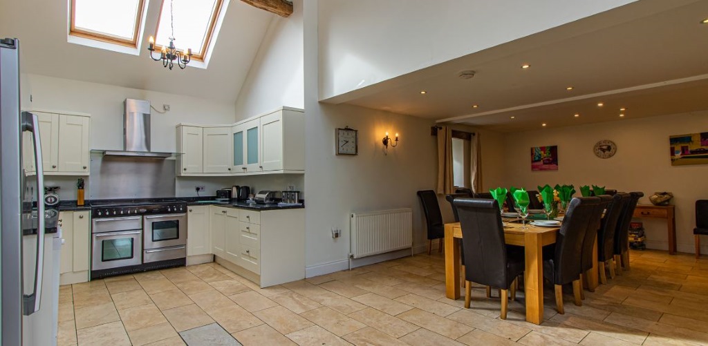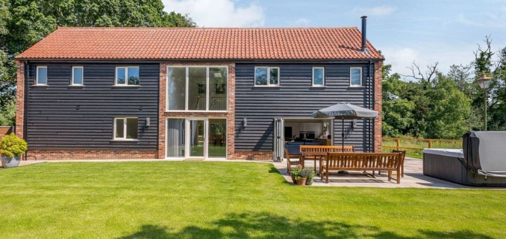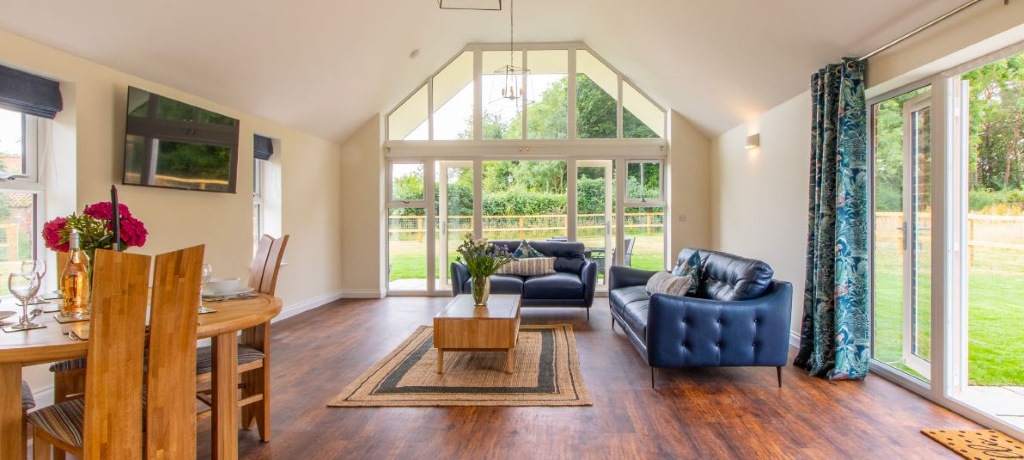 This barn is ideal for large families or groups looking for a relaxing retreat, sleeping up to 14 people. On the ground floor is an open plan living space with a spacious ultra-modern kitchen with a range of appliances for home cooking, including an American-style fridge/freezer, dishwasher and coffee machine. The lounge area includes a 65’’ Freeview smart TV with Apple TV and wood burner. 7 bedrooms are available. On the ground floor, there are 2 king en suites and 1 twin en suite, plus a separate toilet. The first floor has 2 king en suites and 2 twin en suites. Outside there is a lawned garden and patio area with a table and chairs for al fresco dining over a few glasses of wine.
