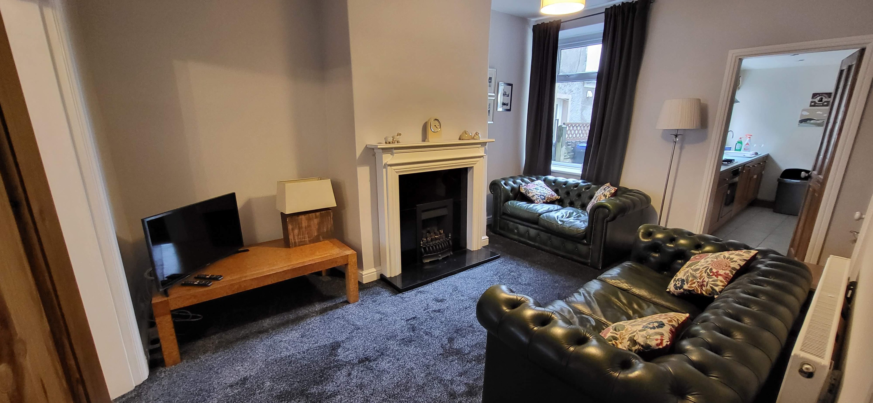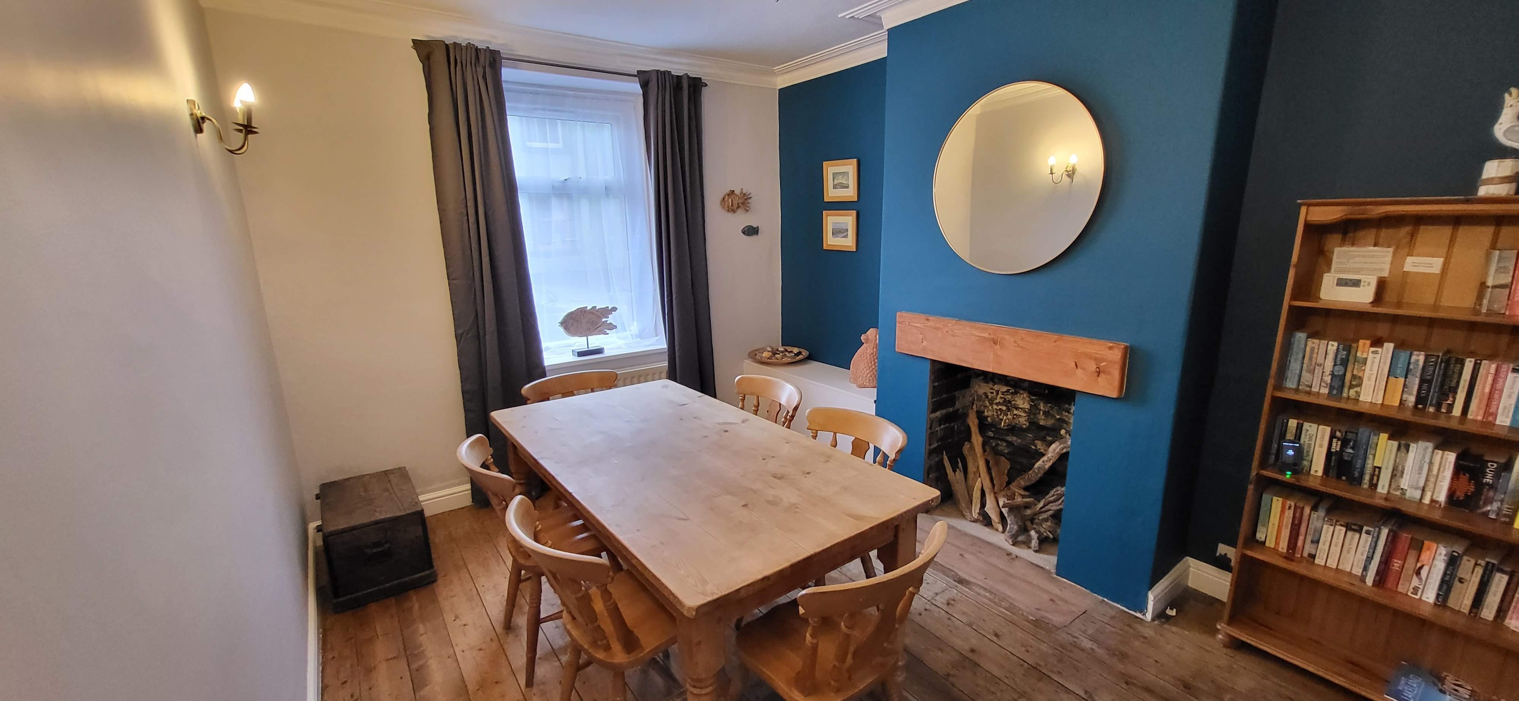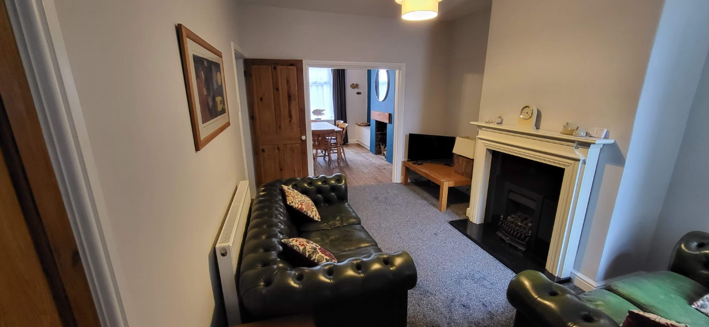 The lounge features two comfortable chesterfield sofas, a flatscreen TV with Freeview, a coffee table and a gas fire. The kitchen is equipped with everything you might need, including an oven, grill and hob, dishwasher, fridge, small chest freezer, microwave, coffee maker, toaster and kettle. This room leads to a utility area with a washing machine, additional games and beach equipment. The dining room includes a farmhouse table with seating for six, a well-stocked bookcase, a games chest and a bench seat.