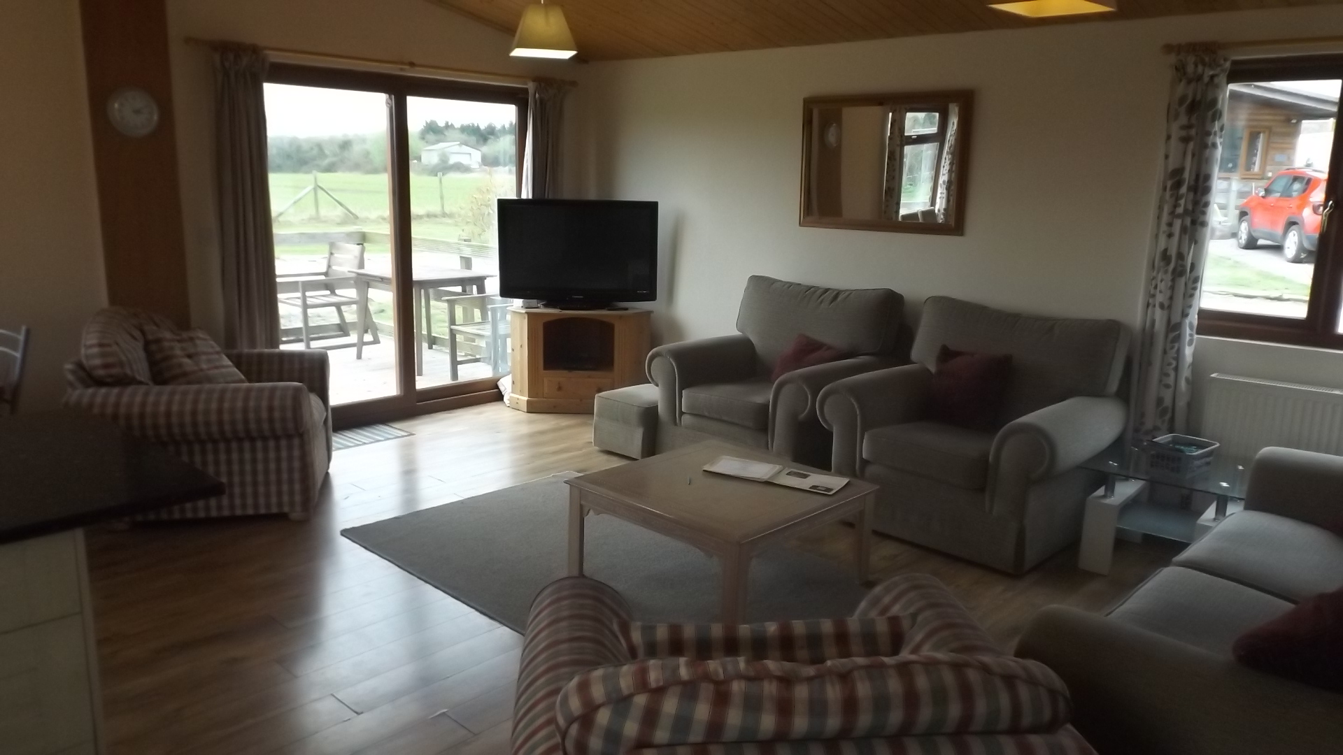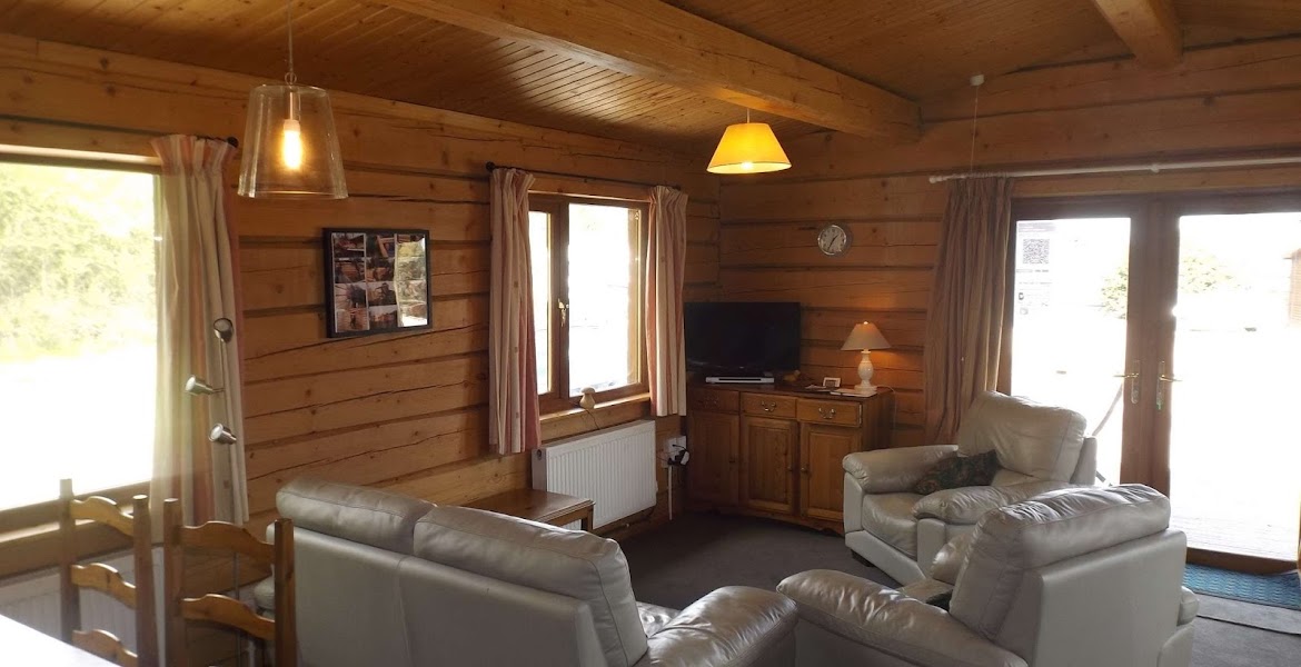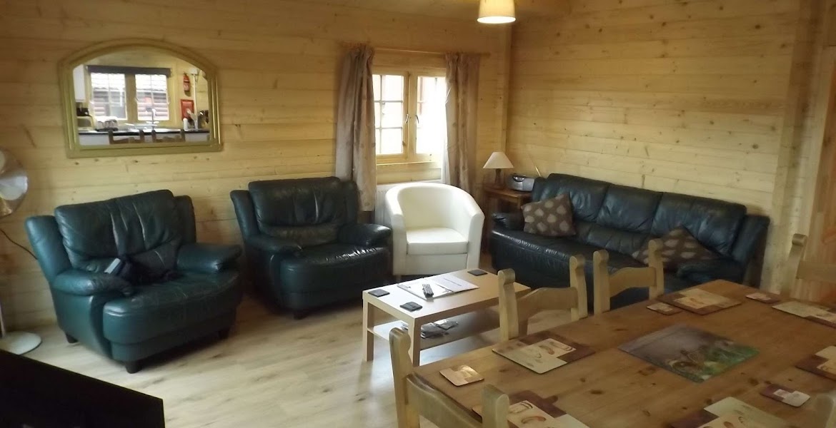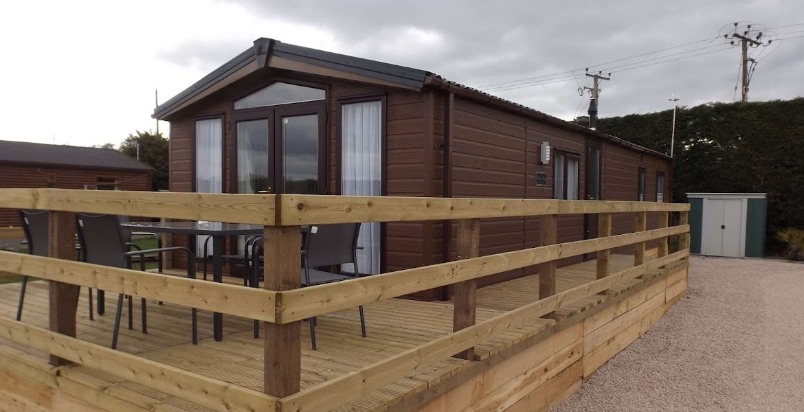The three-bedroom log cabins, Holly Lodge and Oak Lodge, each sleep up to seven people and offer spacious open-plan living areas with countryside views, fully equipped kitchens, central heating and double glazing. Both have flexible bedroom layouts including zip-and-link beds, double rooms and rooms with bunks and a single bed. Daisy Lodge provides a similar level of comfort in a three-bedroom lodge built on a caravan chassis, with a double bedroom, two single rooms, a full kitchen and a raised decking area reached through French doors.