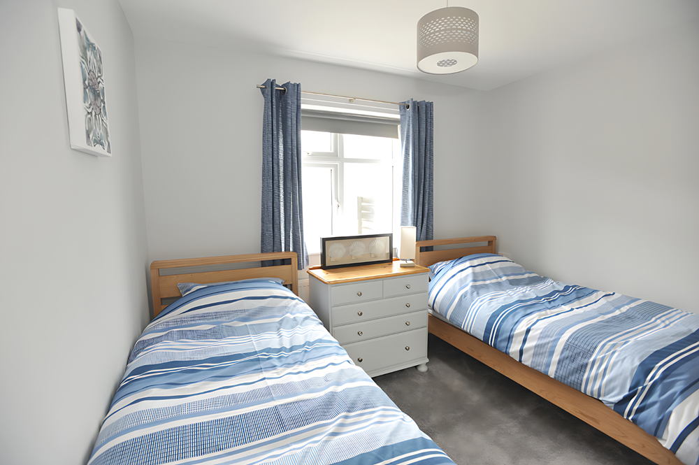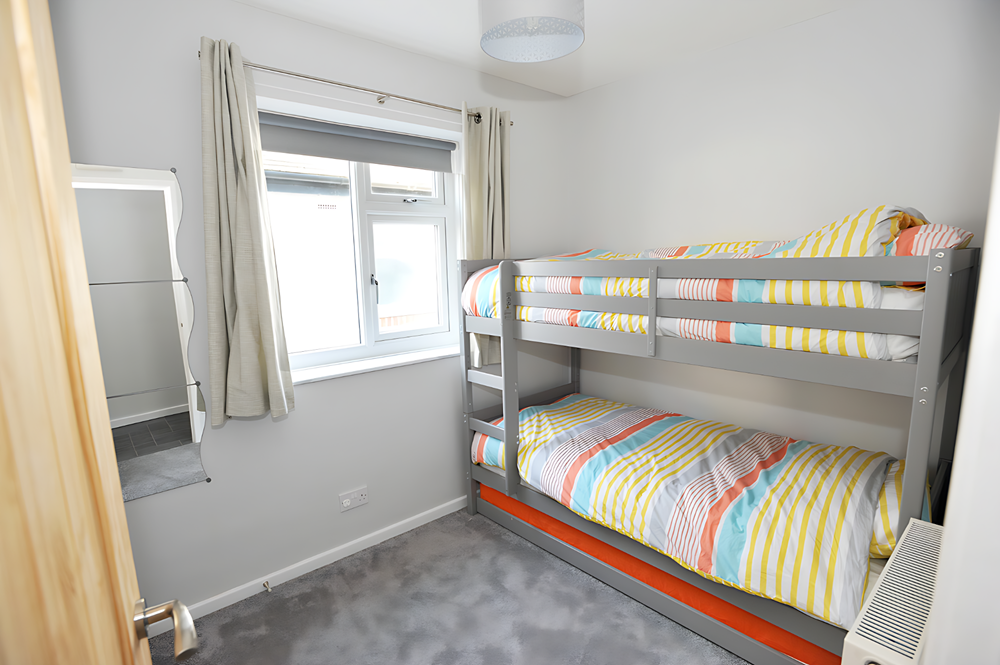 The spacious kitchen and dining area is designed for easy home-from-home living and comes well equipped to make cooking and eating together a pleasure. All accommodation is set on one level, with three tastefully furnished bedrooms featuring new beds and quality mattresses. Blackout blinds in each room ensure restful lie-ins. The double bedroom is snug but comfortable, with a pocket-sprung mattress and built-in storage. The twin room has two stylish single beds, a chest of drawers and additional built-in storage. The bunk room features modern bunk beds with deep pocket-sprung mattresses suited to adults and children alike. A small bathroom includes a toilet, corner bath with integrated shower and underfloor heating and a separate cloakroom provides an additional toilet and basin.