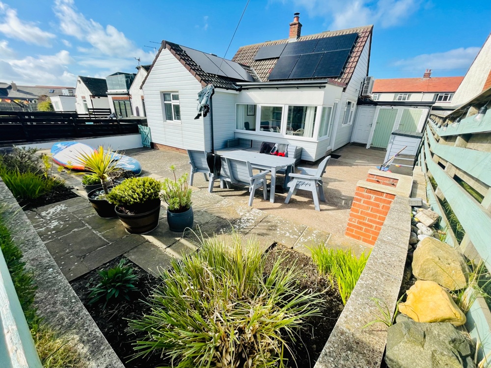 Outside, a sheltered south-facing patio sits at the rear of the cottage, catching the sun for most of the day and offering an ideal spot for outdoor dining or relaxing. A wooden table and chairs seat six comfortably, making it perfect for meals or barbecues. A gate in the garden opens directly onto the dunes, where a short sandy path takes you straight to the beach, from the top of the dunes, you can take in wide, uninterrupted views over Beadnell Bay, the harbour, the historic Lime Kilns and further along the coast, the silhouette of Dunstanburgh Castle.