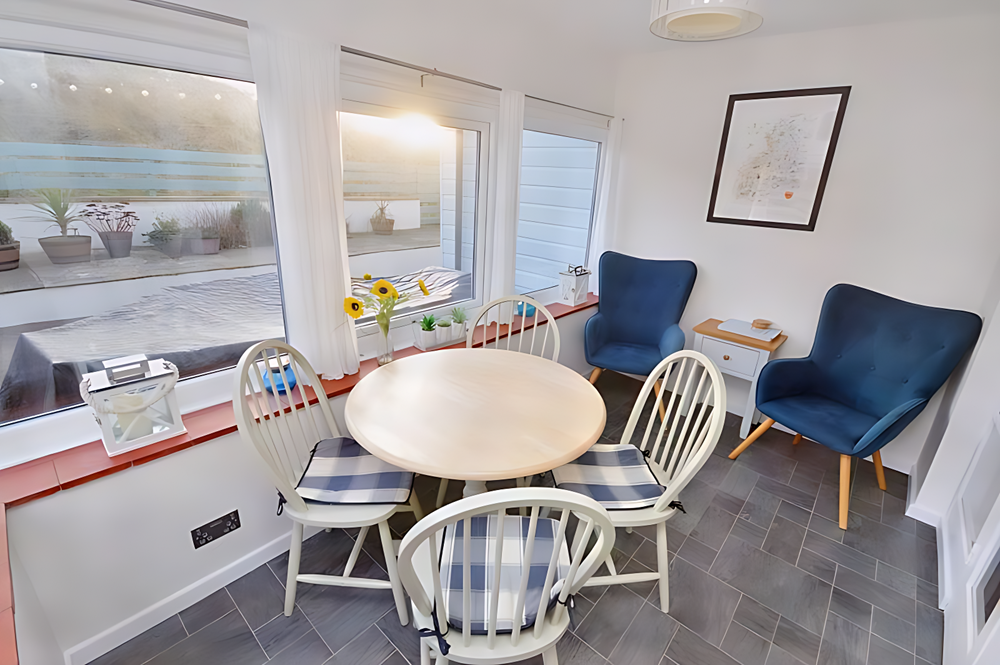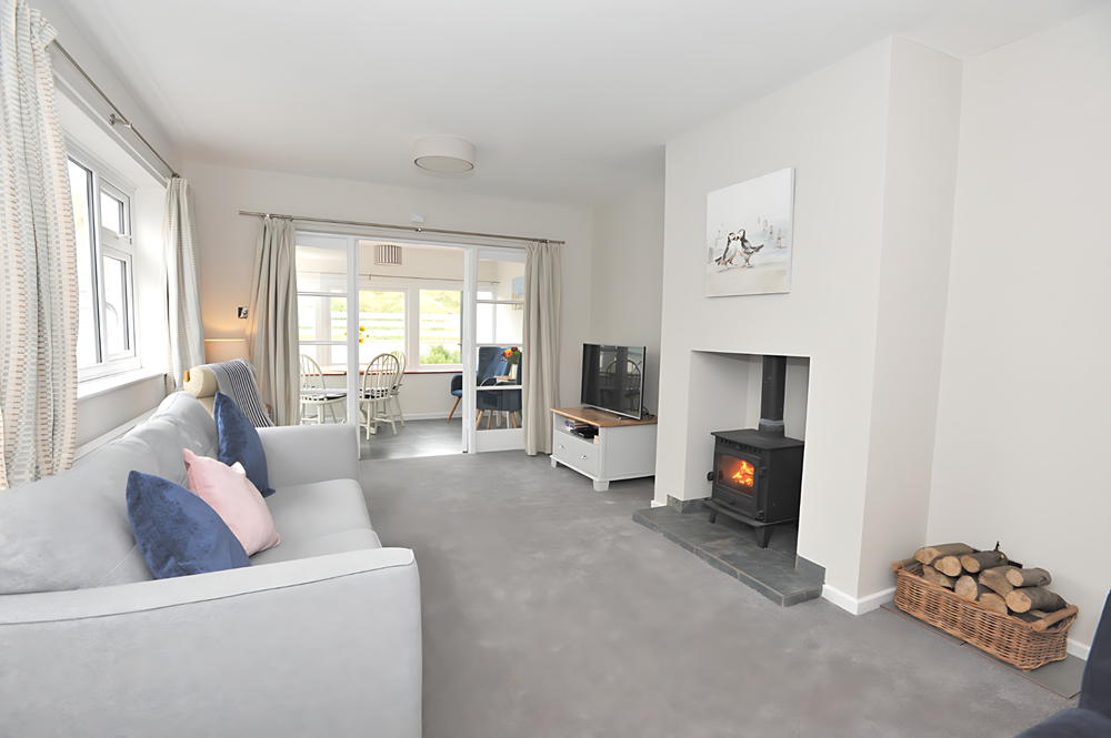 The bright sunroom provides a peaceful spot for morning coffee or meals overlooking the patio and dunes, with two comfortable chairs perfect for reading or unwinding. A door leads directly from here into the rear garden. The living room is a cosy and relaxed space, ideal after a long day out; light the wood-burning stove, settle onto one of the large sofas or the armchair and enjoy a book, a film or a favourite series on the Smart TV and DVD player.