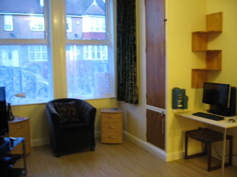 The bedroom features a five foot electric double bed with individual controls, or alternatively two adjustable single beds on request. These can raise or recline at the touch of a button to ensure a restful sleep. The room has easy-clean vinyl flooring, bright décor, a wardrobe with mirror and an optional under-mattress fire alarm for deaf guests.