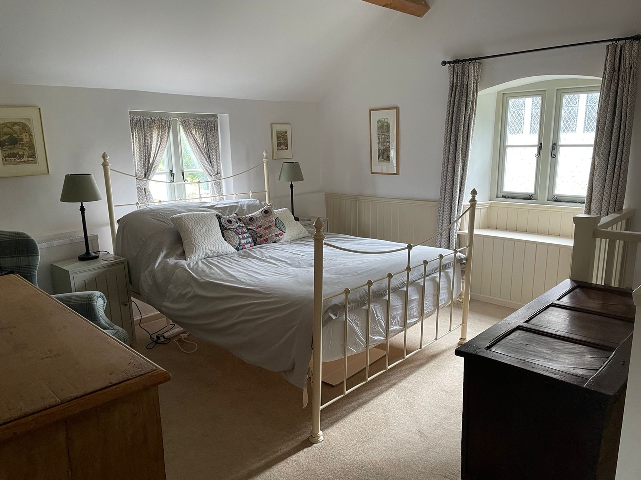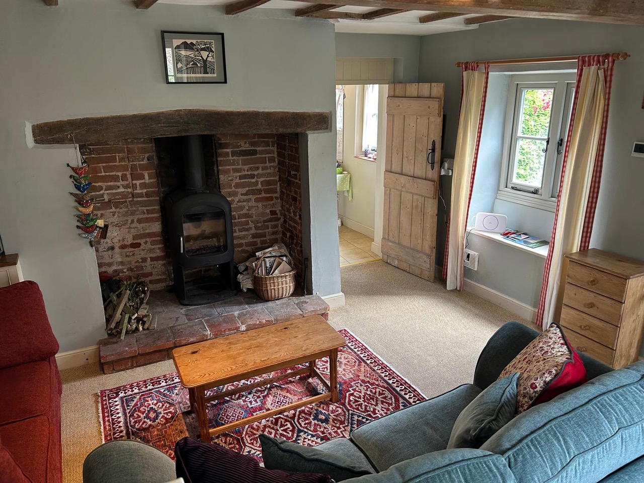 The cottage sleeps up to three guests. On the ground floor, a small quarry-tiled entrance hall offers space for boots and outdoor gear, leading through glazed doors to a cosy, beamed sitting room with a wood-burning stove, please note, there is no TV, but there is wi-fi. From here, a doorway opens into a spacious beamed kitchen and dining room, where cooking is done on an electric Aga. A microwave is also provided, and a washing machine is located in the outhouse. There is no dishwasher, but a radio and CD player are available, so guests should bring their own CDs.