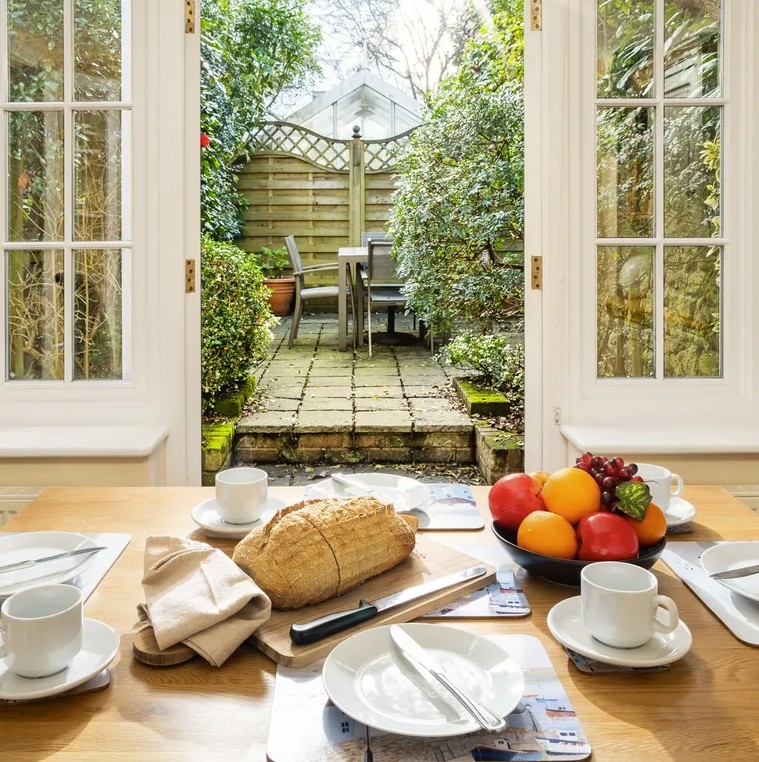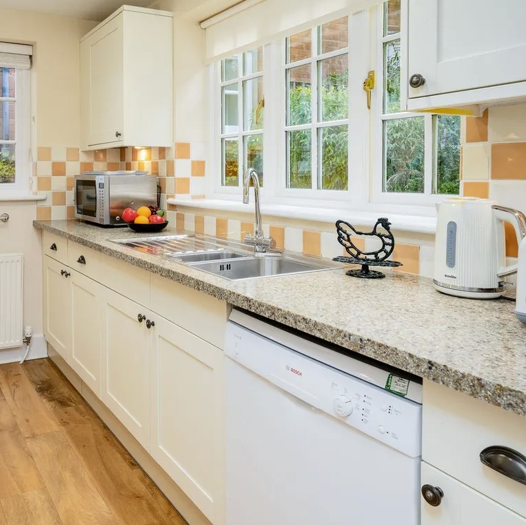 This charming 17th-century, centrally heated cottage features a spacious double-aspect lounge where you can relax on a comfortable sofa while enjoying programmes on the 56-inch Smart TV with free Wi-Fi. The dining area is set within a beautiful lantern-style conservatory, while the fully fitted kitchen includes an electric oven and hob, full-size fridge/freezer, microwave and dishwasher, with a shared laundry room providing a washing machine and gas dryer. French doors from the dining room lead out to a south-facing garden furnished with seating for six, and there is also a convenient ground-floor toilet. On the first floor, the bedroom offers twin beds that can be linked to create a super king-size bed, along with an en-suite shower room with a shower cubicle and W.C., while the second floor features another bedroom with twin beds that can also be configured as a super king-size, complemented by an en-suite shower room and a separate dressing room.