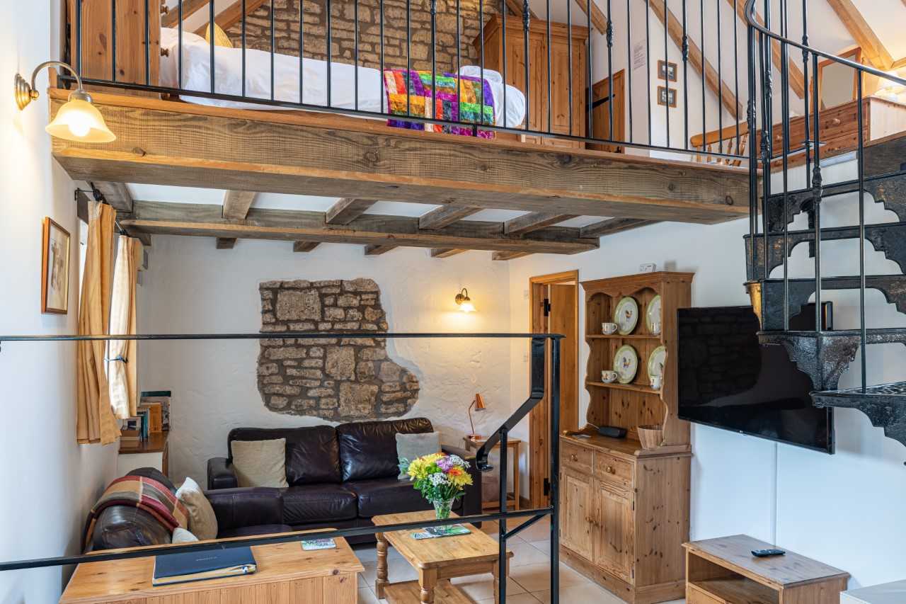 Originally the stables this cottage has been converted to provide accommodation for 2 people. The ground floor has an open plan living space whilst up the spiral staircase to the super king-size bed.