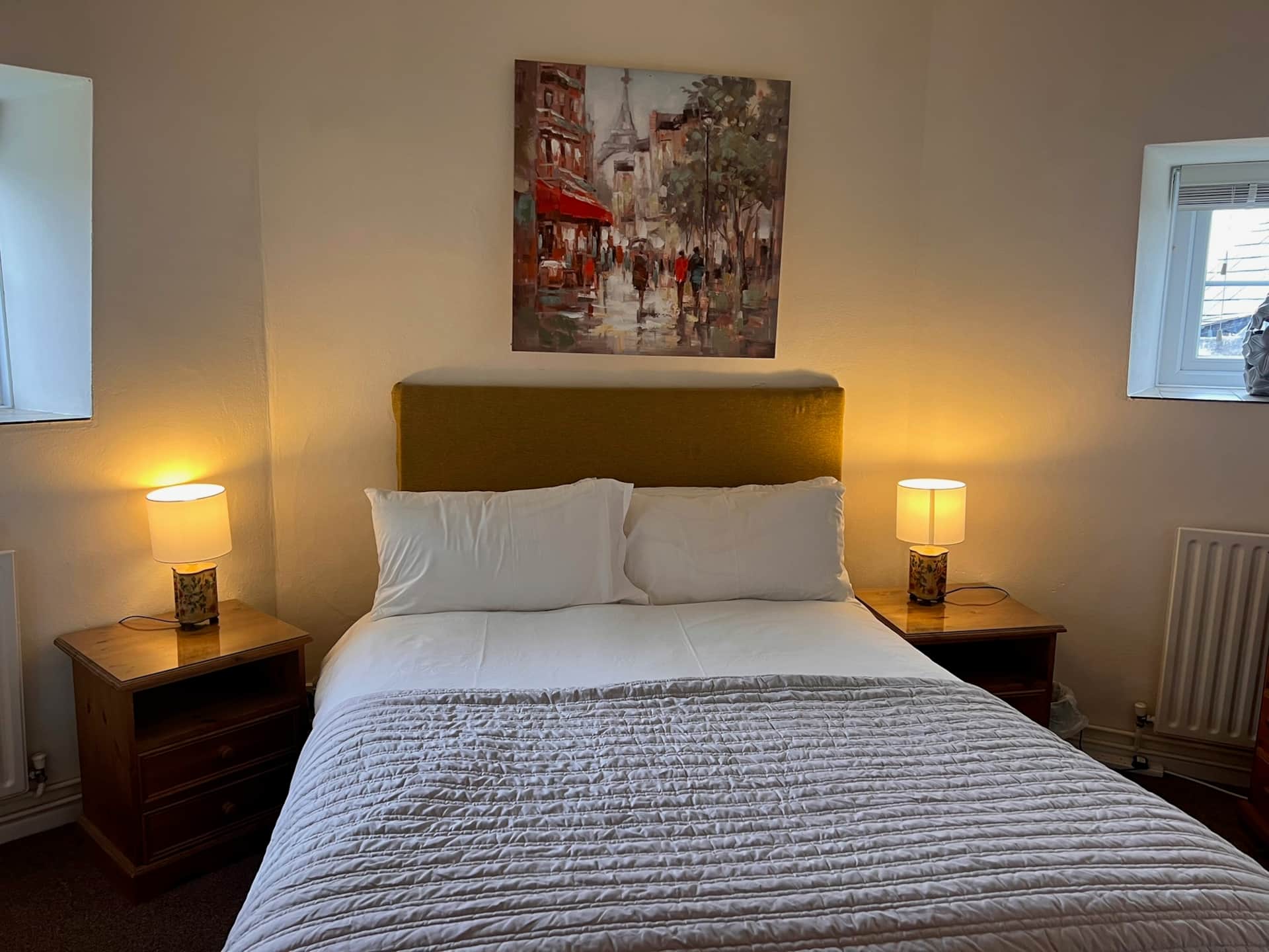Coach House has a similar layout to Stable Cottage. Upstairs there is a twin and a room with a double bed and a single bed. A downstairs bathroom has a walk-in shower.