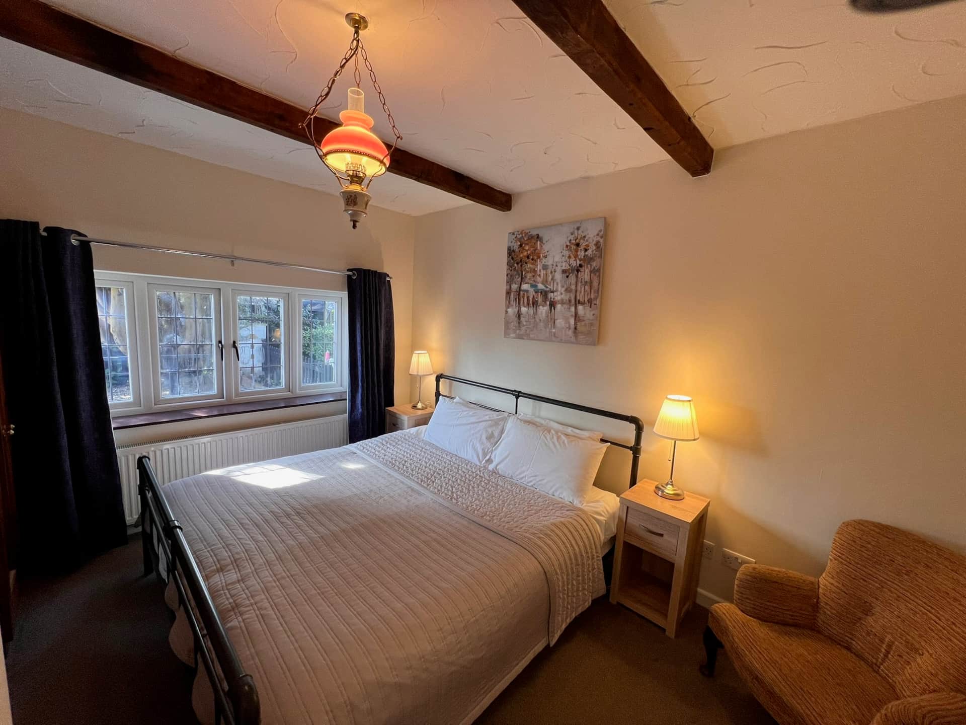 Stable Cottage is semi-detached. It has two bedrooms and a private garden. The upstairs bedrooms include 2 singles and a room with a king size bed and single. The downstairs bathroom has a walk-in shower.
