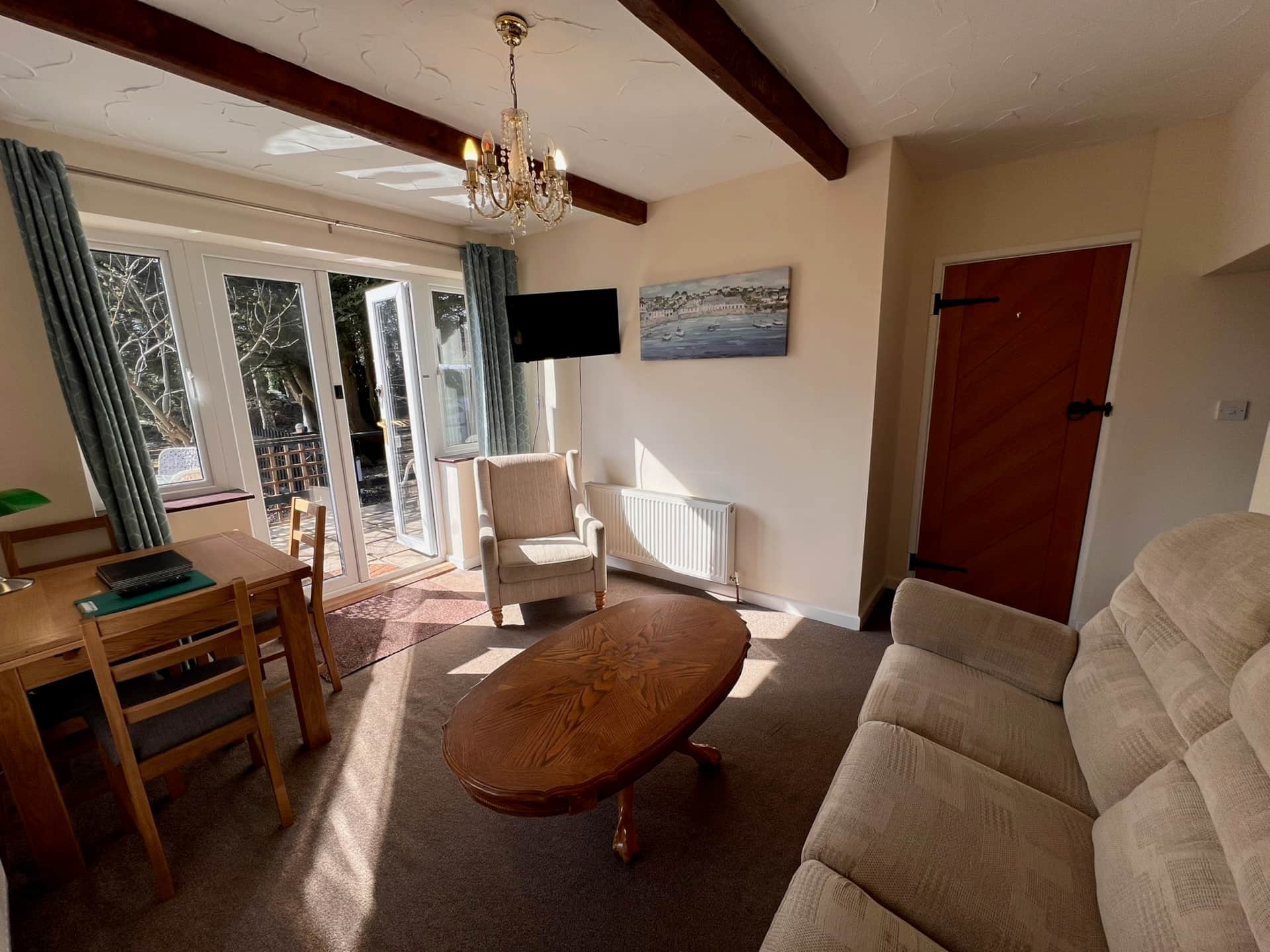 This apartment has an open plan living space and a double bedroom. The apartment is on the first floor of the Mill and has an external staircase leading up to it. Outside there is a garden with a BBQ.