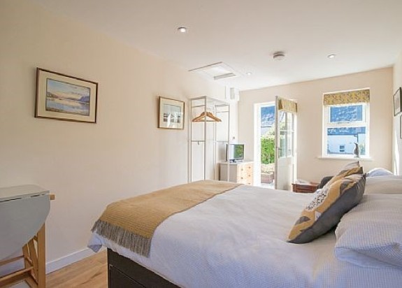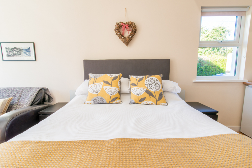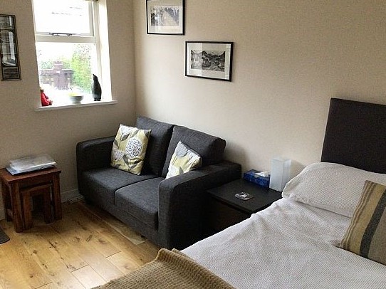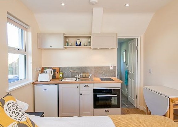 The studio has a main living area measuring approximately 2.6 metres by 5.5 metres, making it ideal for up to two people. It includes a mini kitchen, a double divan bed and a comfortable seating area with a television. Free Wi-Fi is also available for guests to use throughout their stay.