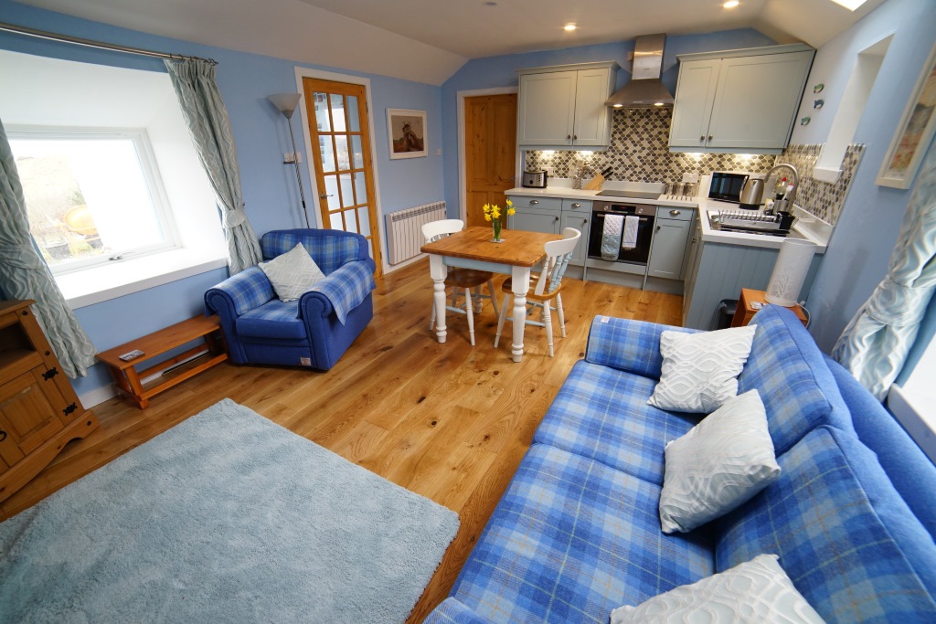The kitchen is fully equipped and comes with a range of appliances: induction hob, fan assisted oven, toaster, kettle, microwave oven, fridge with small freezer box. There is a washing machine in the laundry room of the adjacent shed. The living room is equipped with a beautiful logburning stove with solid oak fire surround, satellite TV/DVD player (with catch-up TV services) and music system and a bluetooth speaker. The bedroom has a wonderful 4 poster bed with lightweight drapes. There is a pine wardrobe with drawer below. Bed linen and towels are included. The bathroom has a superb walk in shower with high pressure twin head shower unit, underfloor heating and heated towel rail.