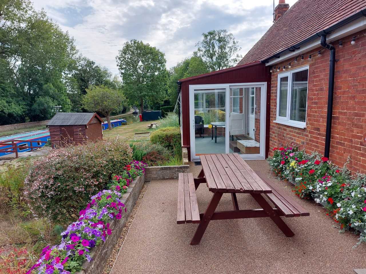 Garden large boatyard grounds with small, private back garden with barbecue and picnic bench and front terrace with table and chairs.