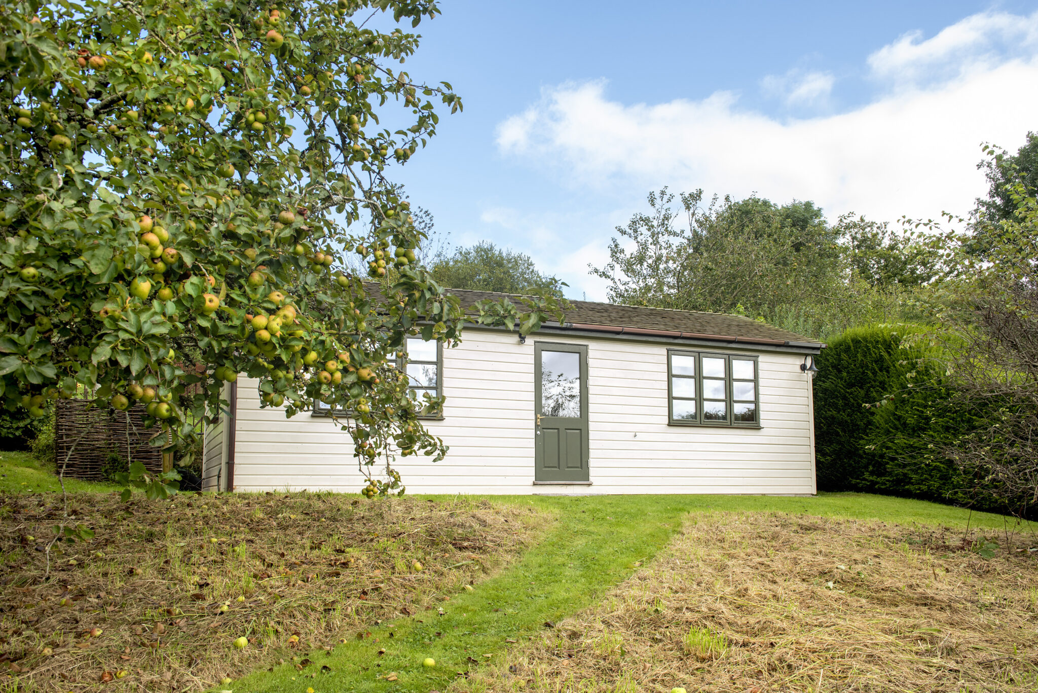 Upstairs, a bedroom with an open mezzanine area overlooks the orchard, offering a tranquil workspace or a cosy spot for a toddler’s cot. All bathrooms are equipped with underfloor heating and the showers are powerful and invigorating. The property also boasts ample outdoor space, with a garden offering spots to dine, relax, or simply enjoy the dramatic sunset views across the valley. Open fires in both sitting rooms, one of which doubles as a music room with a piano, create cosy spaces for afternoon tea or evening drinks.