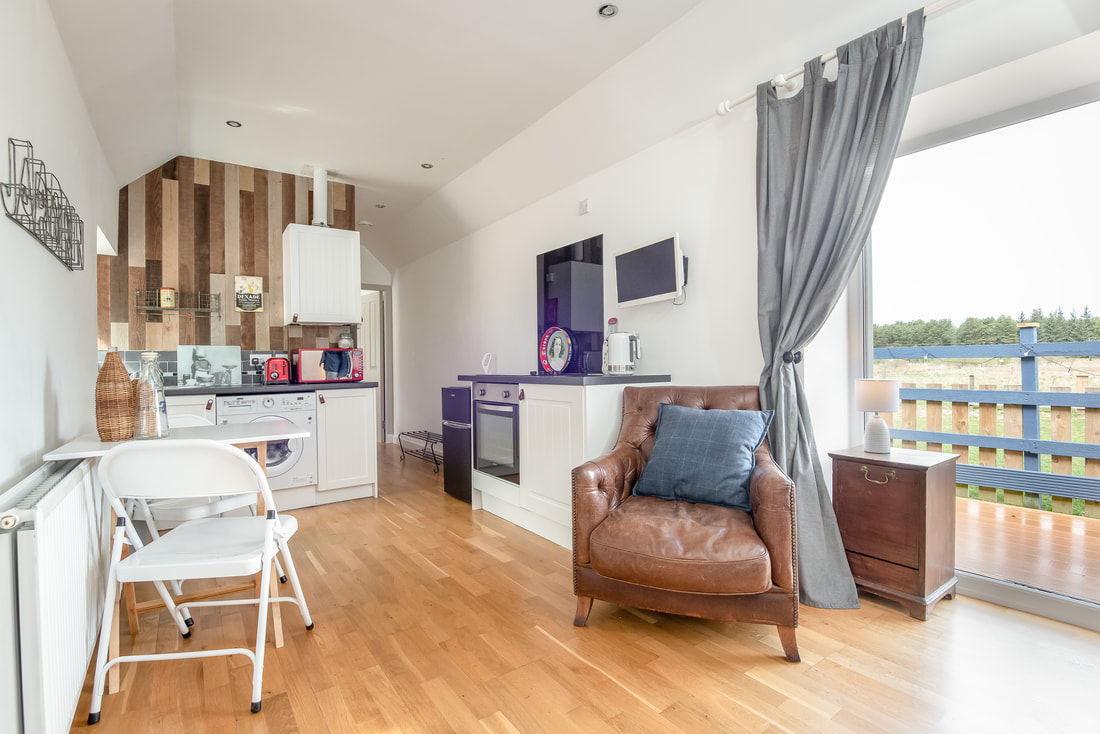 Small but beautifully put together, this charming space is perfect for a relaxing escape to the Fife countryside, ideal for two people and even your dog if he’d like to join the adventure. The detached bothy features a king-size bed, a bathroom with a small bath and over-bath power shower along with toiletries and a comfortable lounge and kitchen area with a large sofa, dining table for two, oven and hob, microwave, small fridge freezer and crockery. A washer dryer is also included, along with towels and bed linen, plus a Smart TV and WiFi for added comfort. Outside, there’s a small enclosed decked patio area with a table, chairs and a private hot tub overlooking the fields to the rear, although the hot tub does not have a cover. One dog is welcome in WeeBothy for a charge of £5 per night, though the space is not well suited to large dogs and guests are asked to read the terms and conditions regarding dogs before booking.