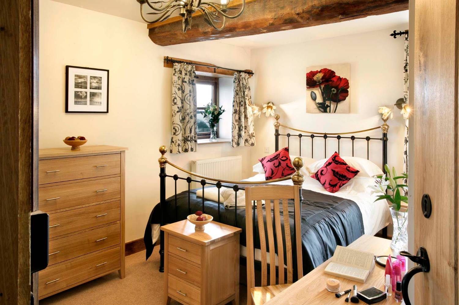 On the ground floor are 5 bedrooms, including 1 twin, 2 king and 2 twin or superking. All the rooms come with en suite facilities, including one room with a gorgeous roll top bath. The twin room comes with wrought-iron single beds and two comfortable day-beds suitable for children. This room has a large wet-room making it ideal for a less able guest.