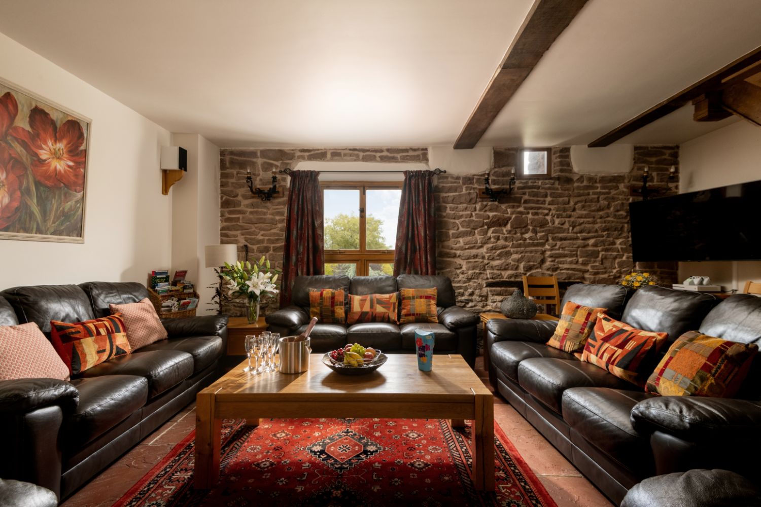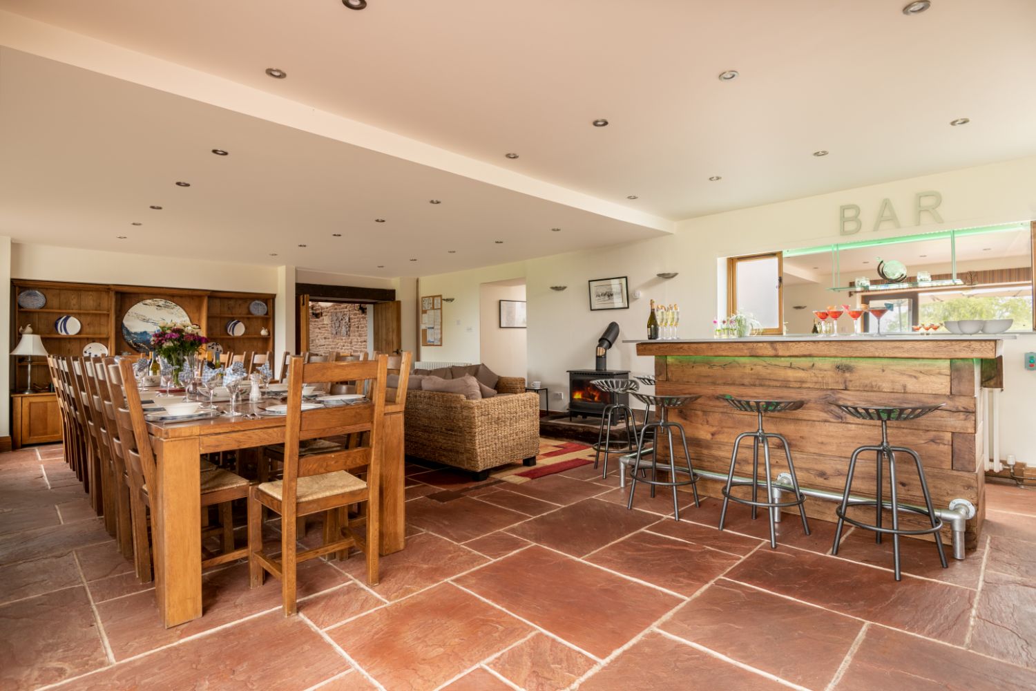 Nestled in an elevated position and enjoying stunning views, this stone barn sleeps up to 18 guests in 8 en suite bedrooms. On the ground floor is a large kitchen and spacious dining room. The dining table seats up to 20 guests and comes with two cosy sofas and an electric log effect fire. A lovely lounge comes with large leather sofas and Smart TV. There is a separate state-of-the-art Cinema Room with tiered seating, surround sound, access to Netflix, Sky, Sky Cinema and Sky Sports.