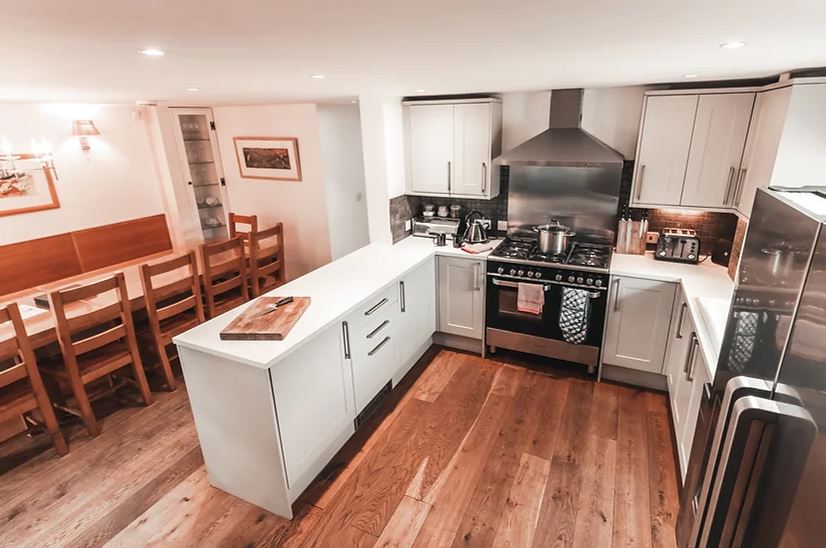 There is an additional fabulous family bathroom on the ground floor too. The large vaulted open plan sitting room with log-burning stove provides an ideal space for social gatherings. There is a modern, well equipped kitchen (including a range, American fridge/freezer and two dishwashers), a dining table for 14, plus a large reception/garden room with piano and big French windows opening onto the secluded courtyard.