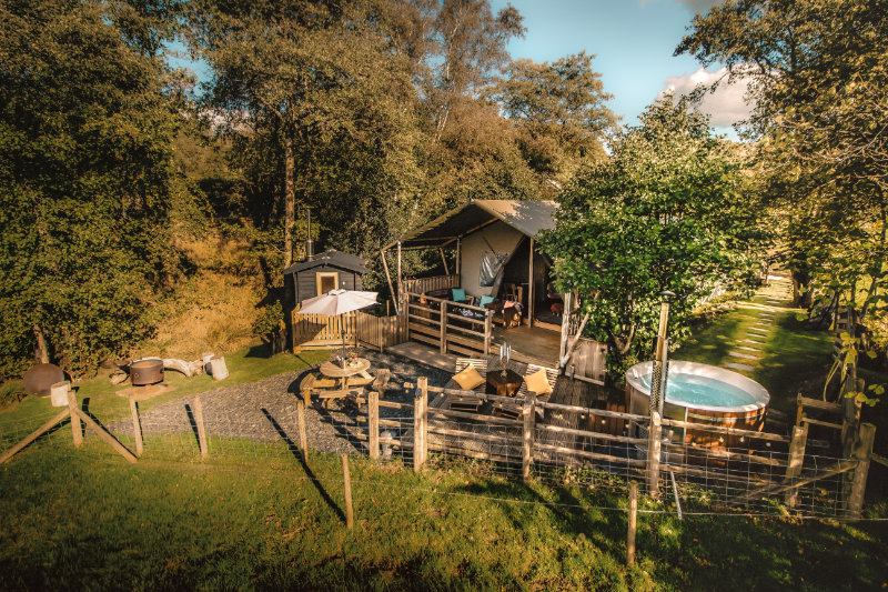 Stellar Safari Lodge is a luxury glamping retreat set among trees on a private family farm near Rhayader in the scenic countryside of Mid Wales. Designed to sleep up to six guests, the spacious safari-style lodge combines the experience of camping with the comforts of modern accommodation, featuring a fully equipped kitchen, cosy living and dining space, wood-burning stove and a private en-suite shower room. Guests can relax outdoors on the veranda deck, enjoy alfresco dining, or unwind in the wood-fired hot tub and traditional sauna, with a fire pit and pizza oven creating the perfect setting for evenings under the stars. Surrounded by peaceful countryside close to the Elan Valley and renowned dark skies ideal for stargazing, the lodge offers a unique and relaxing escape in the heart of rural Wales.