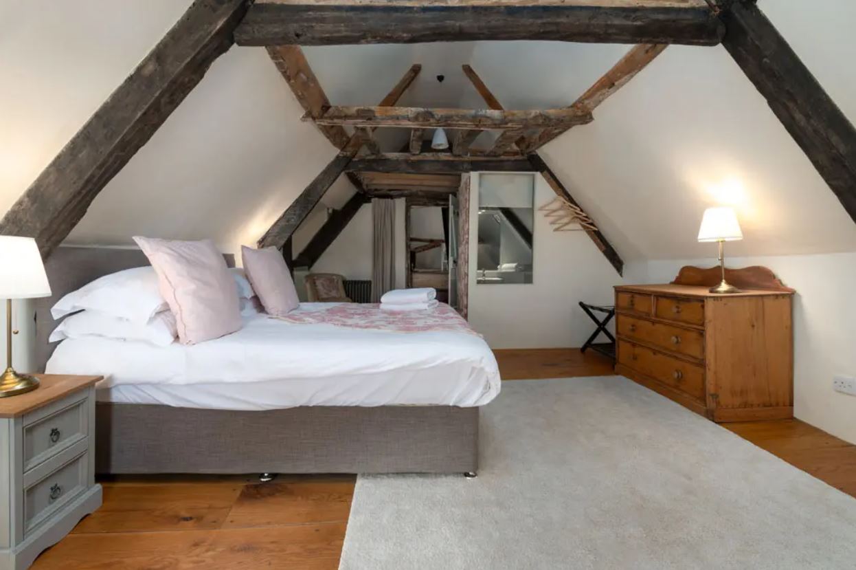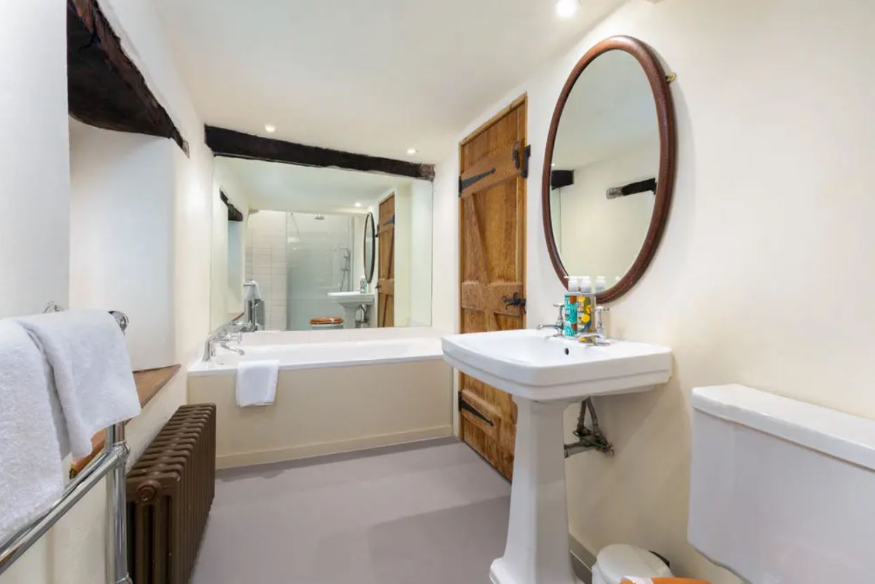 Across three floors, the house offers seven elegant bedrooms accessed via a charming turret staircase with a rope bannister. Four bedrooms and two bathrooms are located on the first floor, while two additional bedrooms and a shared bathroom are found on the second floor, giving the space a storybook feel. All bedrooms feature Egyptian cotton linen, soft furnishings, wooden floors with rugs, bedside tables and comfortable chairs. Storage is thoughtfully provided through hooks and large chests rather than bulky wardrobes. Four bathrooms in total serve the house, each restored with modern comforts while preserving original features and beams.