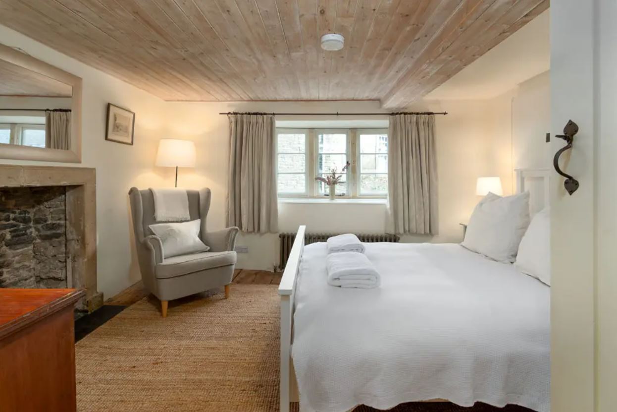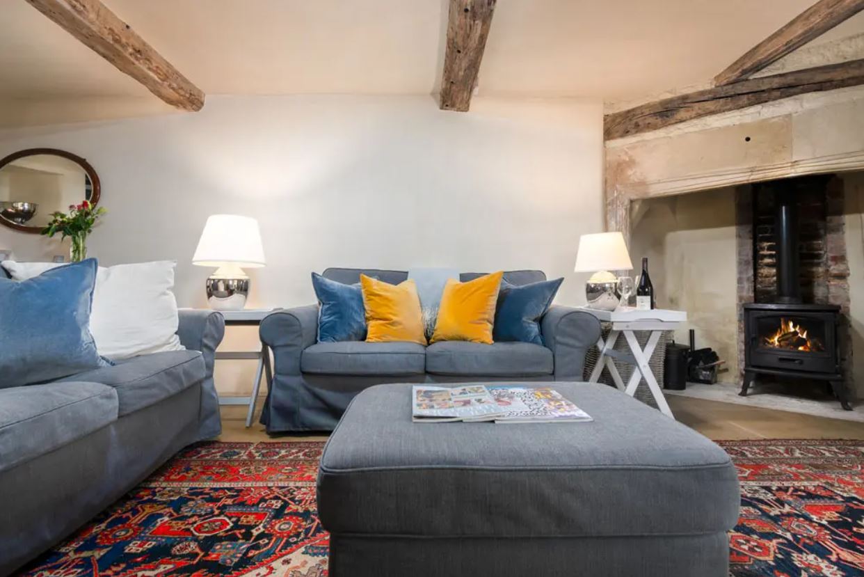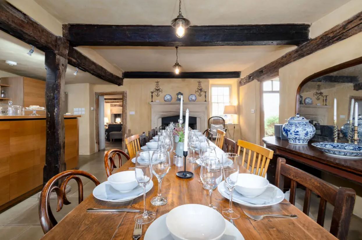 There are two sitting rooms, including the main lounge with an inviting inglenook fireplace that creates a cosy atmosphere on cooler evenings. Comfortable sofas, warm lighting, large cushions and throws make it an ideal space to unwind and a work table is available for those needing to work from home. Beyond this room is the spacious garden room, which overlooks the beautifully kept garden, the church of St Philip and St James and the surrounding landscape. This bright and elegant room is perfect for family games, relaxing in the window seats with a book or watching the 50-inch smart TV.