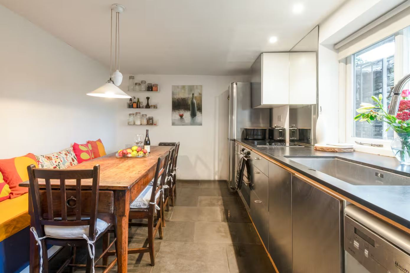 Inside, the bright and spacious living room features large windows and glass doors that overlook the garden, allowing natural light to fill the space. A Smart TV, a stone fireplace with a wood burner and a well-stocked bookcase create an inviting setting for a relaxing stay. The fully equipped kitchen includes a large wooden dining table, perfect for enjoying home-cooked meals. A downstairs shower room also houses a washing machine for added convenience.