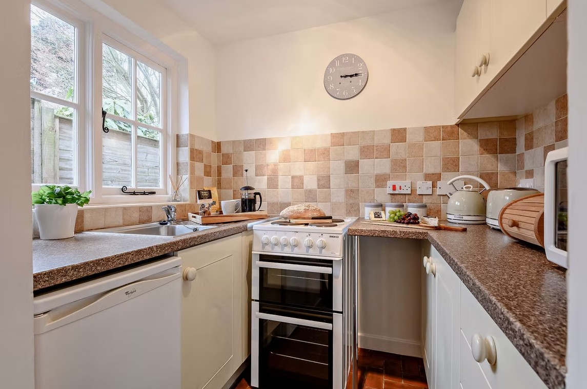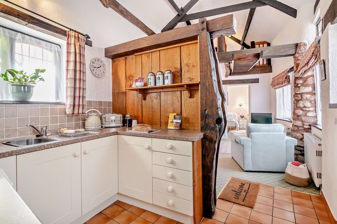 The Old Coach House is a secluded retreat designed with couples in mind, featuring patio doors that lead onto a private, enclosed terrace that enjoys plenty of southern sun. Inside, the vaulted ceiling and exposed beams create a warm, inviting atmosphere, making it a peaceful hideaway tucked out of sight. The main double bedroom includes its own dressing area, with a bathroom conveniently located nearby, and just off the living space is a compact yet well-equipped kitchen with all you need to prepare anything from a simple meal to something special.
