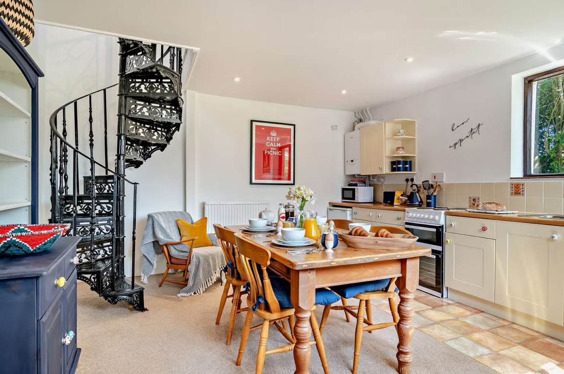 Stables Cottage enjoys views towards the manor house draped in wisteria and can accommodate up to four guests, with a main double bedroom and a twin room served by a family bathroom. Set on one level, the cottage features an open-plan living, kitchen, and dining space, where oak-panelled walls and exposed beams add warmth and character to the interior.