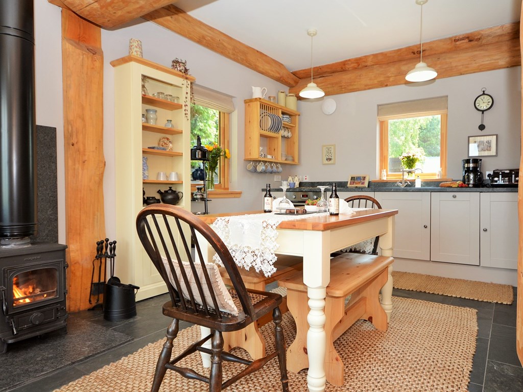 Inside this beautifully furnished cabin is a lovely open plan kitchen and living area with a toasty wood burner for those chilly days. The living area includes comfy seating and smart TV to watch your favourite show. The patio doors offer spectacular countryside views. Enjoy some home cooking in the fully-equipped kitchen that comes with a range of appliances: oven/hob, integrated dishwasher and fridge freezer and a washing machine/tumble dryer.