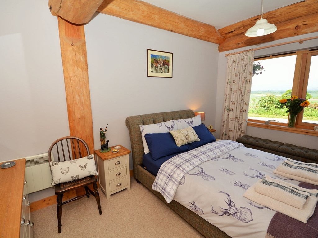 Two bedrooms are available. A ground-floor master room is furnished in Harris Tweed and boasts a luxury memory foam mattress with soft bed linen. The room enjoys glorious views toward Cairn o' Mount. Upstairs there is a double bedroom with an open plan seating area including a double sofa bed. A bathroom has a high-pressure shower with complimentary Shetland soaps.
