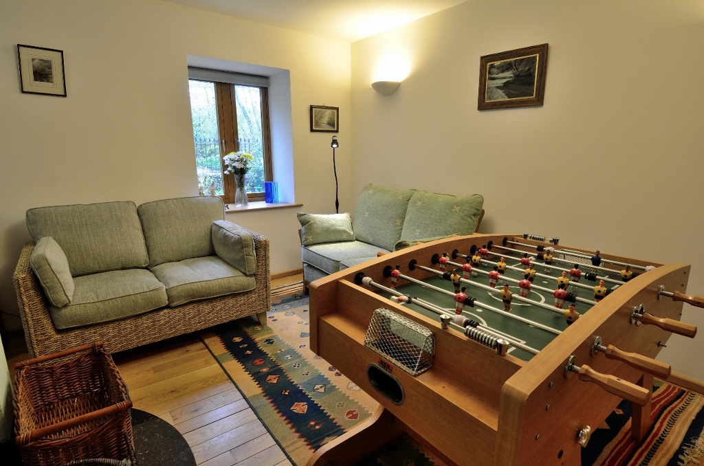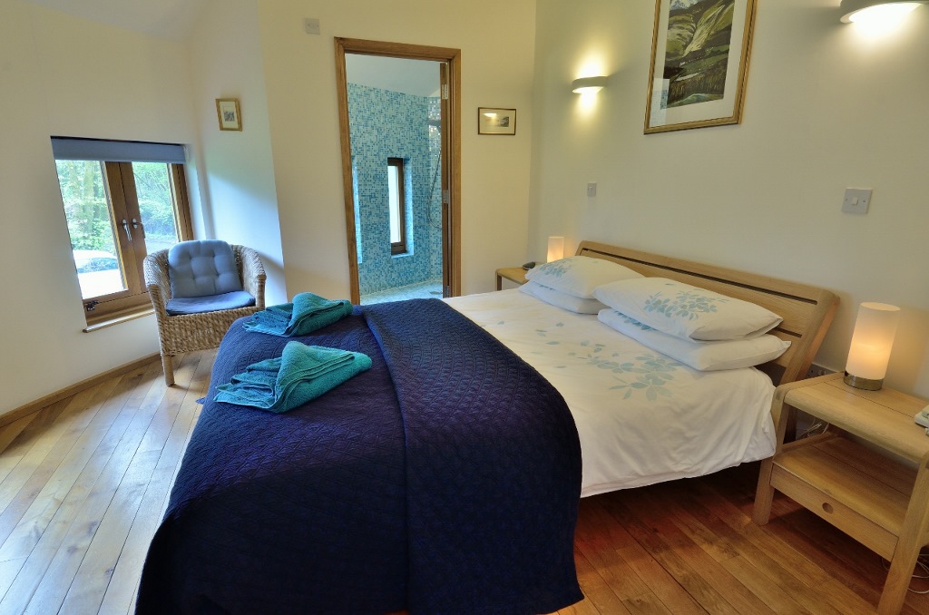 On the ground floor we ahve a lovely open plan area to relax in. The living area comes with a double-sided wood-burning stove, 40’’ LED TV with Freeview, DVD player, table football, games, puzzles and comfy seating. The spacious kitchen/dining area has a Range master cooker with two ovens, Miele fridge-freezer, Miele dishwasher, plus washing machine, tumble dryer, microwave and a full supply of cooking equipment. Doors open onto a pretty slate patio area with a table, chairs and BBQ. The perfect place for a morning coffee whilst enjoying views of the garden, brimming with local wildlife.