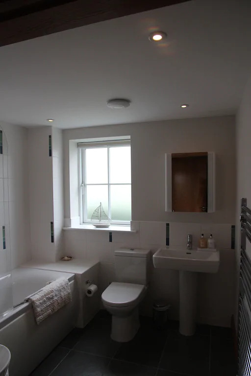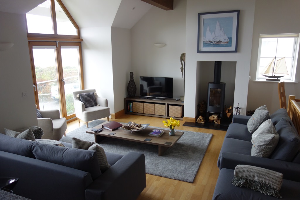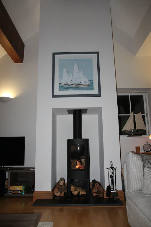 An open plan living area is spacious and brimming with light. Bi-fold doors open onto a Juliet balcony offering amazing views. The living area includes a toasty wood burner, smart TV, a separate DVD player and a sofa bed (for an extra charge). The dining and garden table seat 6. A fully-equipped kitchen includes granite worktops and breakfast bar, double oven, microwave, fridge freezer, dishwasher, coffee maker and all other utensils and items.