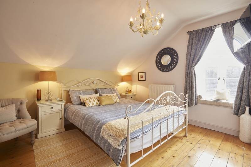 On the first level there is a bright bathroom with a large bath and a separate shower room to avoid queues. The twin bedroom is cosy and traditional, with a window seat and soft colours. The double bedroom offers a crisp and elegant style with a Victorian bed, plush bedding, a smart television and a comfortable armchair positioned by the window. On the upper level, the master bedroom features a king-size bed, atmospheric lighting, a walk-in wardrobe, an en-suite shower room and an arched window that fills the room with light.