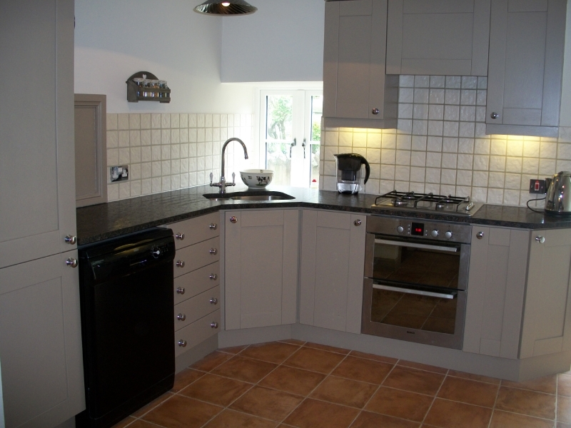The spacious lounge and dining area is warm and inviting, featuring original beams, an open cast iron fireplace, smart TV, window seats and a large L-shaped sofa. Thoughtful décor and subtle lighting add to the relaxed feel. A solid oak dining table provides plenty of room for meals or board games. The kitchen combines cottage charm with practical design, offering granite worktops, a gas hob, electric oven, dishwasher, fridge, freezer and a washing machine.