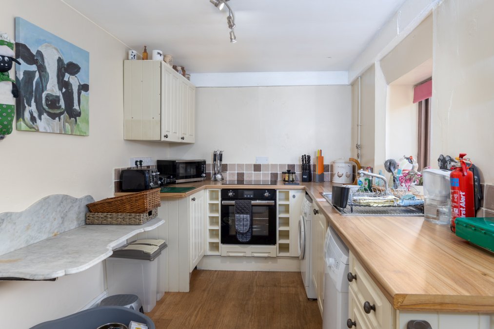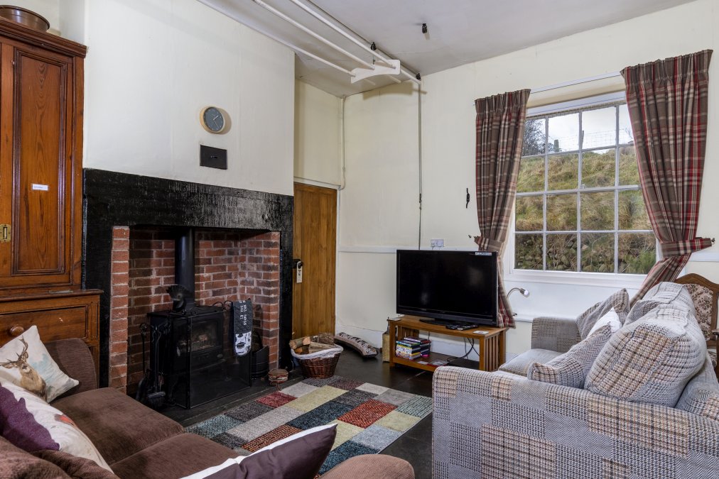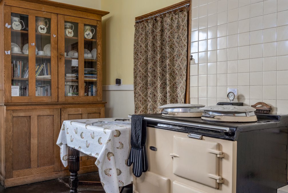 The cottage features a large open-plan living and dining area with a wood-burning stove, Freeview TV and an Aga, alongside a separate, fully equipped kitchen with oven, hob, fridge, freezer, microwave, dishwasher and washing machine.