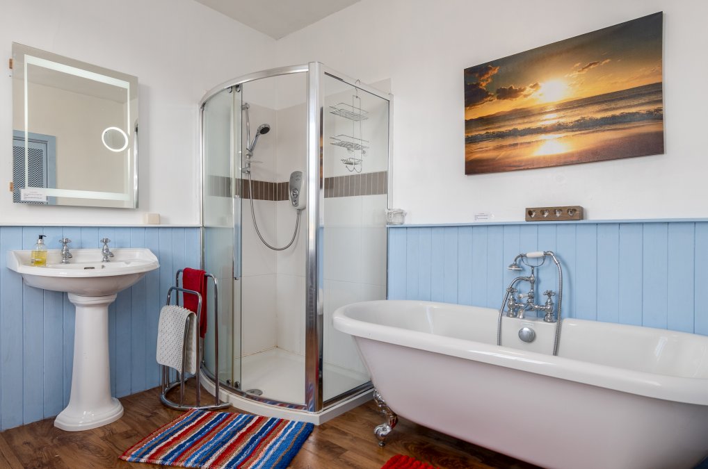 On the first floor, there are two bedrooms: one double room and another double room that also contains a single bed and bunk beds, comfortably sleeping up to six people. A sofa bed in the living room can accommodate any extra guests for short stays by arrangement. The spacious bathroom includes a roll-top bath and separate shower cubicle.