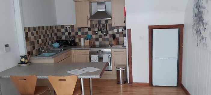 Fitted kitchen including electric hob, oven, microwave oven and fridge/freezer.