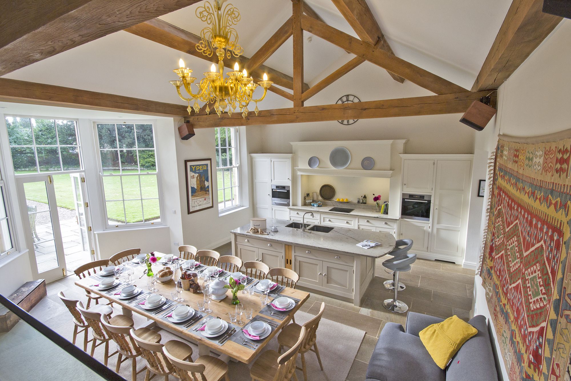 Inside, Darley House blends period charm with modern comfort across an impressive 4,800 square feet of space. The property features six beautifully styled bedrooms, offering flexible accommodation for groups, along with four elegant reception rooms that provide a variety of spaces for relaxing and socialising. At the heart of the home is a stunning kitchen and dining area, thoughtfully designed for gathering together. Fully equipped with high-spec appliances, it includes a large dining table seating up to fourteen guests, making it ideal for shared meals and special occasions. Character features such as stone floors and vaulted ceilings combine seamlessly with contemporary design to create a warm and inviting atmosphere.