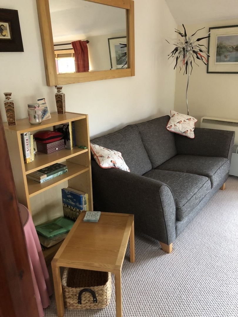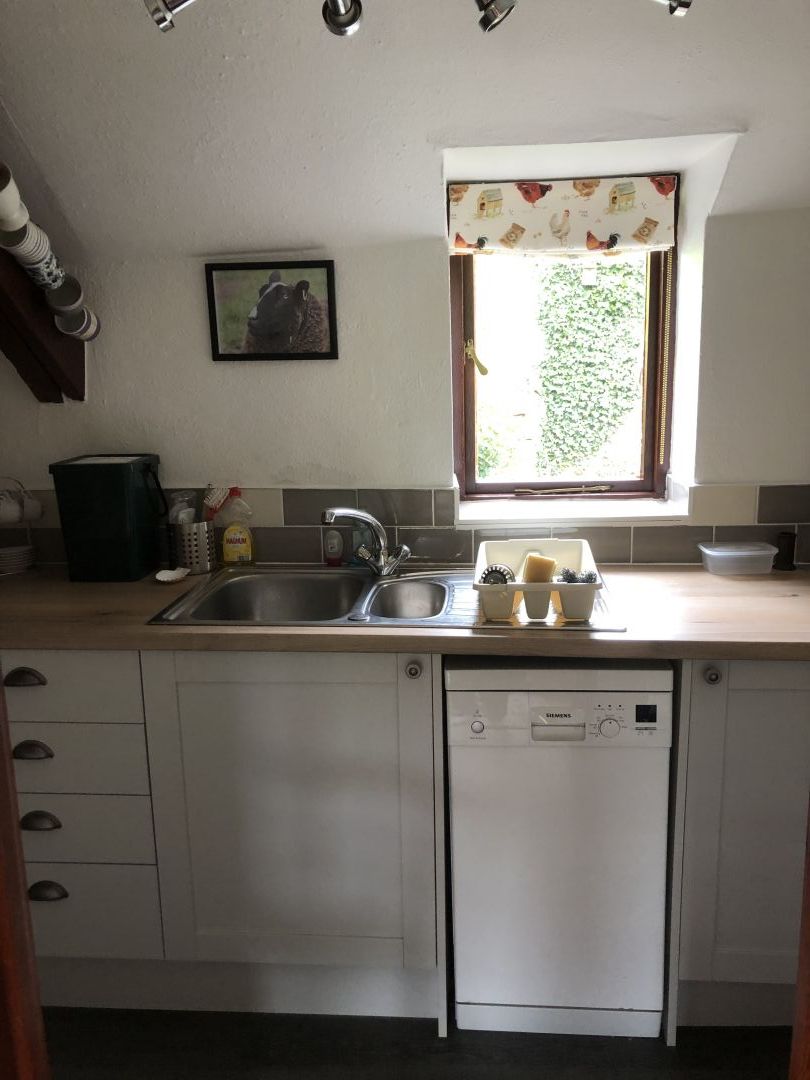 The living area, situated on the first floor, offers dual-aspect windows that perfectly capture the beauty of the garden and the surrounding countryside. Here, guests can unwind with a Freeview TV, an array of books and various games. The kitchen, though compact, is fully equipped with everything needed for two guests, including the convenience of a slimline dishwasher.