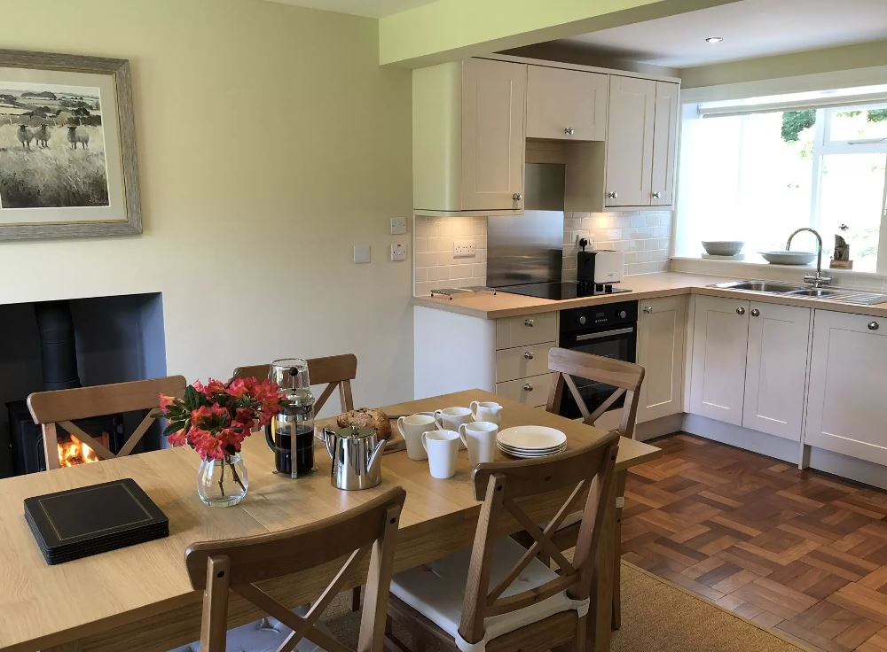 There is a very spacious dining/kitchen area with cosy wood burning stove and table to seat up to 8 or 10 people. The kitchen has a dishwasher, oven, hob and fridge and the utility room off has a microwave, freezer and washer/dryer. The sitting room has also has a wood burning stove and south facing window plus south facing French doors opening to the fantastic enclosed space of the two acre private garden. Free logs and free wi-fi are enclosed also.